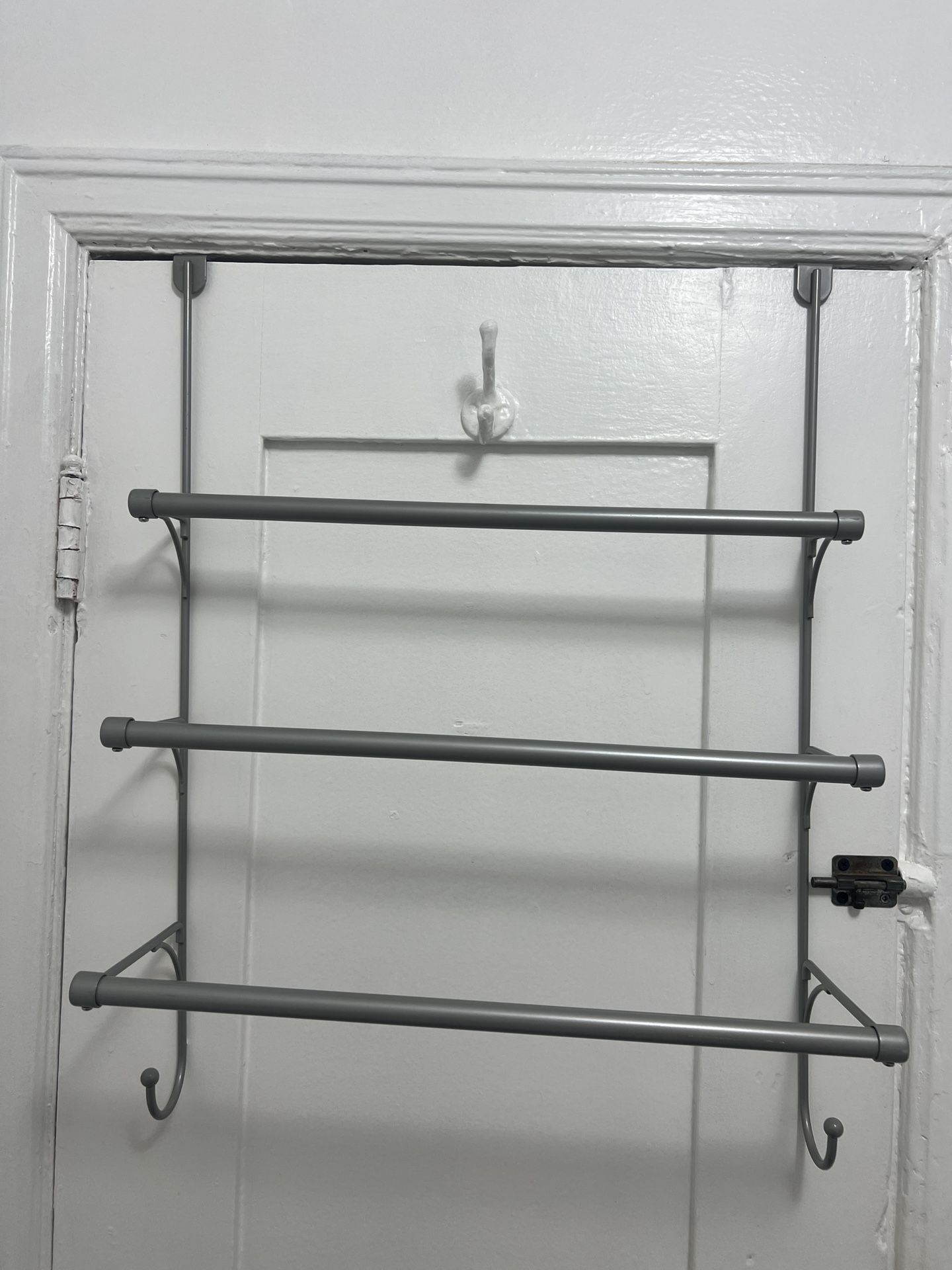 Grey , Lightweight over-the-door towel rack with hanging hooks at the end.