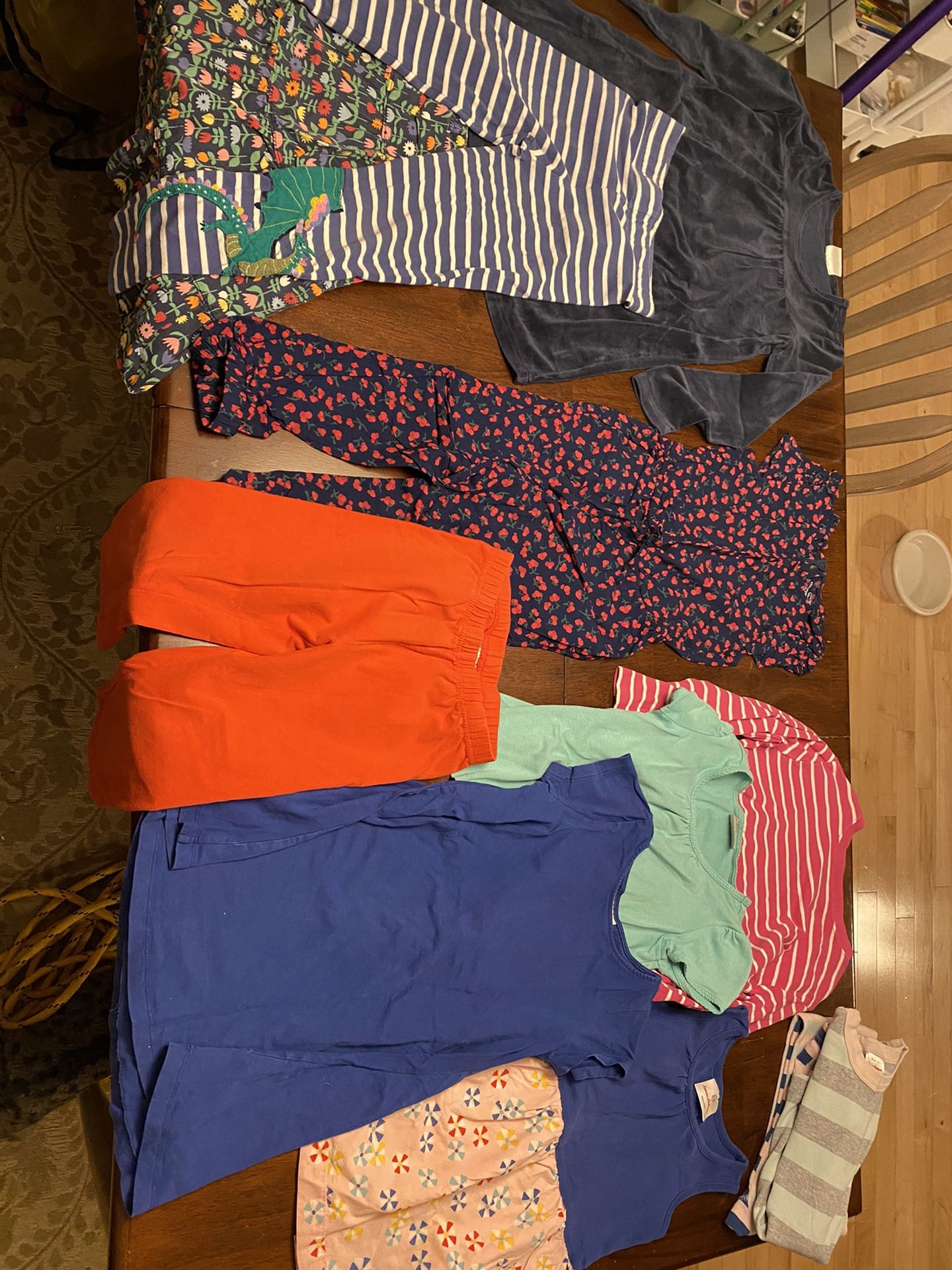 4 shirts - Size 110 cm 1 set striped pajamas - 120 cm 1 pair pants - 110 cm 1 flowery skirt - 110 cm 1 jumper suit (vineyard vines brand) Fits girl size 5-6 years of age (size on the tags is European measurements (cm))