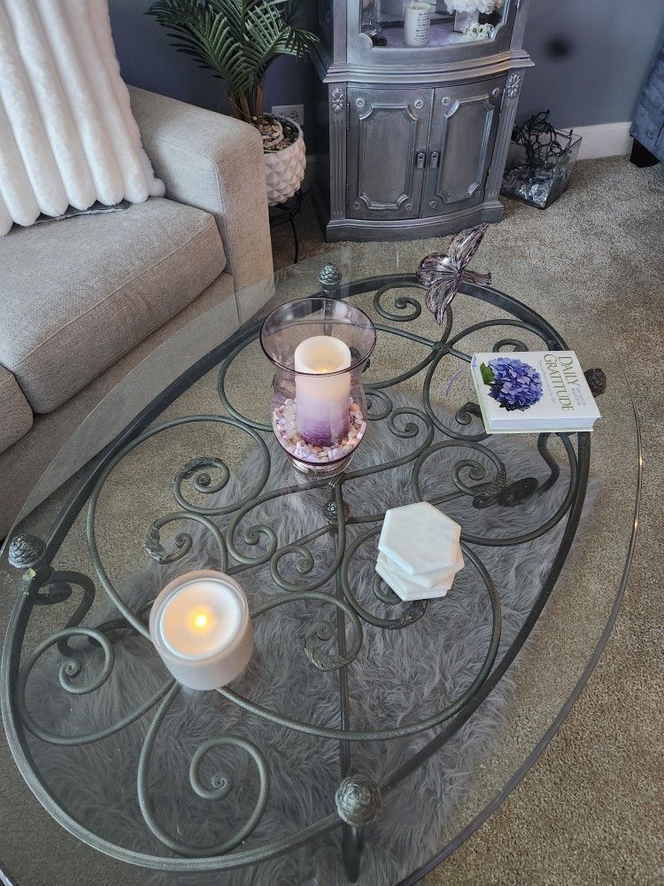 Beautiful ornate metal glass table, perfect for a LR or FR! W 51" x D 34" x H 19"