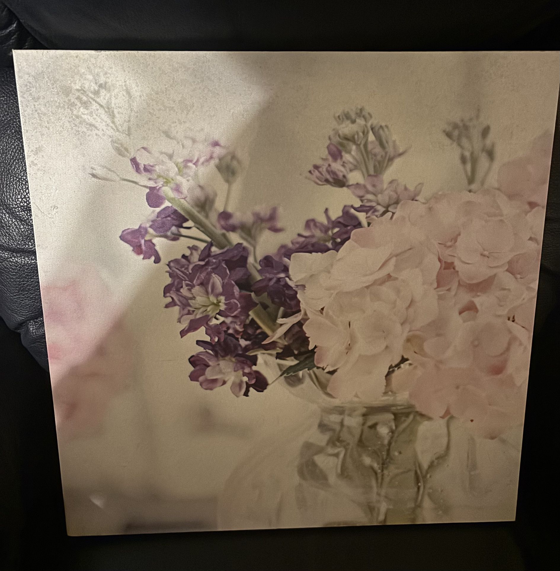 Pretty canvas print. Has pink and purple flowers in a vase. Nice wall decor.
