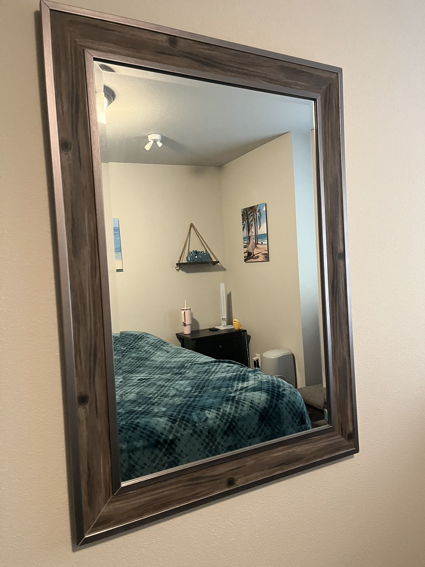 Basic mirror, 43x31 inches, quite large. Has a small crack in the corner (as seen on pic).