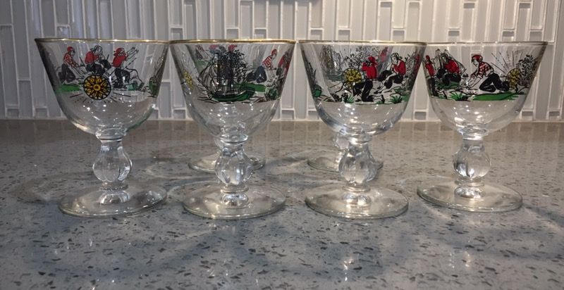 Set of 6 pirate glasses with gold rim. Made in 1953.
