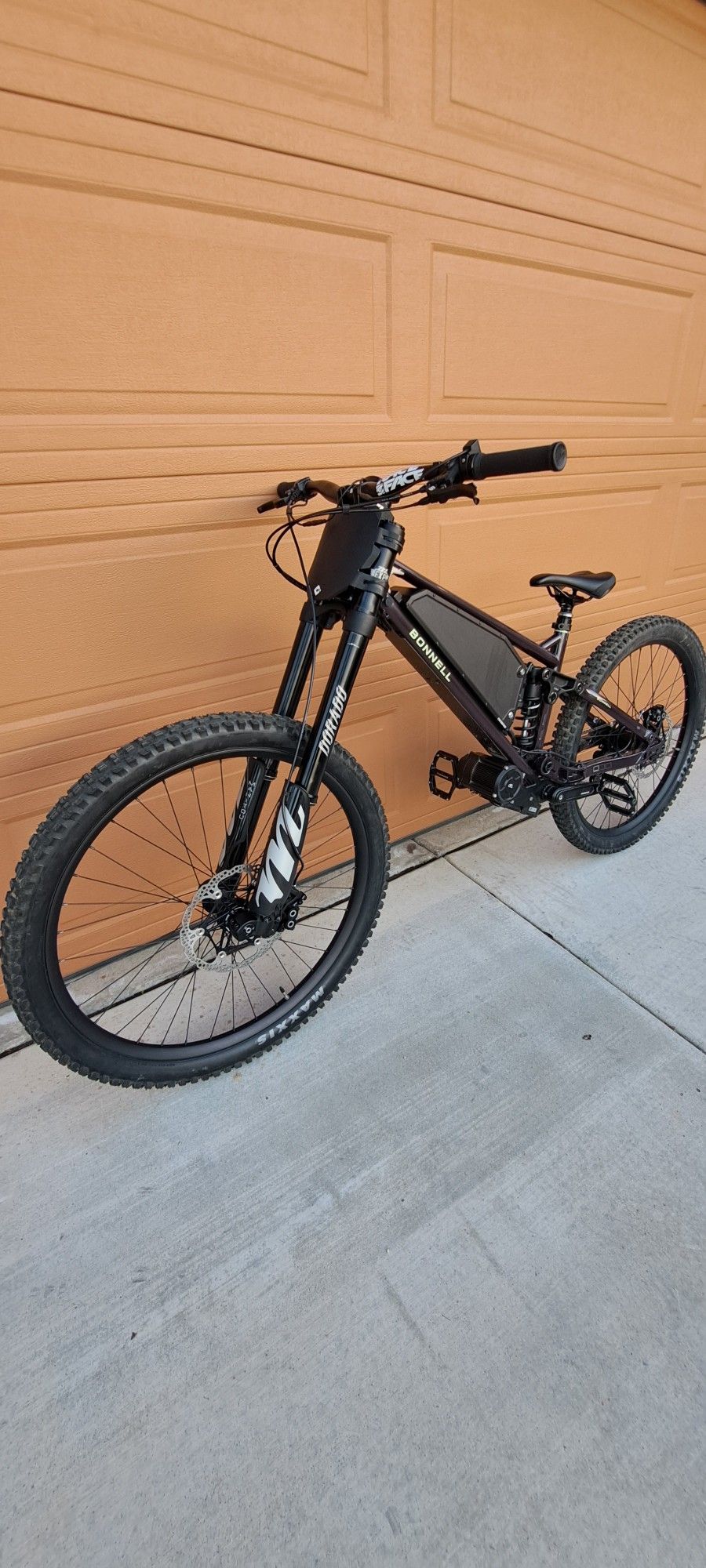 Baddest Bonnell on the west coast, medium 775 mx from the latest batch, comes with heavy duty wheels, shorter crank arms, rear coil spring shock, manitou dorado expert inverted forks, hope floating brake rotors 220mm front 203mm rear, raceface aluminum 740mm bars, odi direct mount stem, cane creek 40 zero stack headset. Comes with charger, air pump for suspension, manuals, tool kit. This bike handles like a downhill bike, feels like a stark varg and has surron power. Twist throttle, 37mph top as of now until the new firmware comes out. No trades!!!!!!! Also comes with stock bars, forks, brake rotors, and stem.