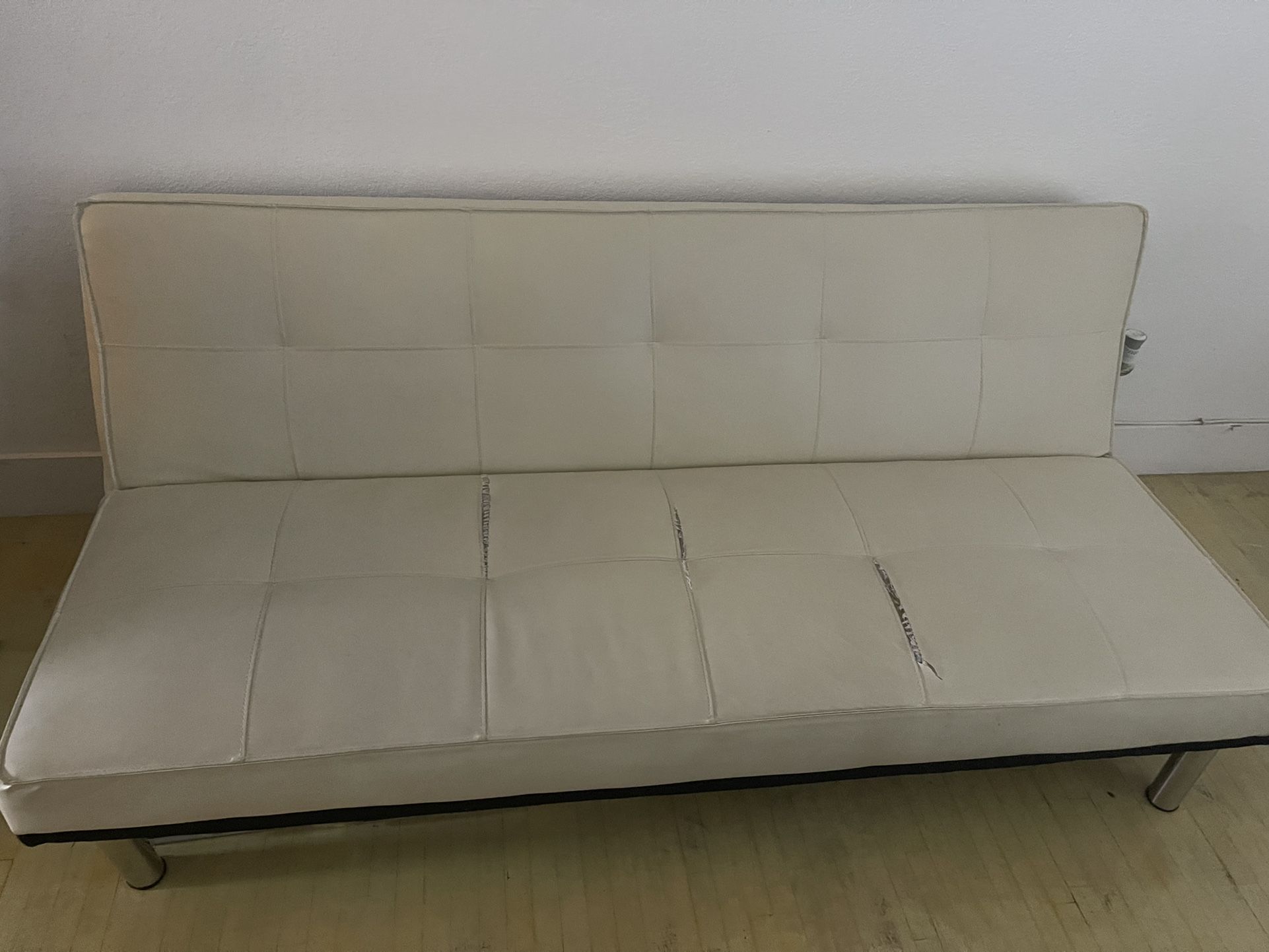 Used leather sleeper sofa - cream with silver accents. There are small tears in the fabric that can easily be convered with a blanket!