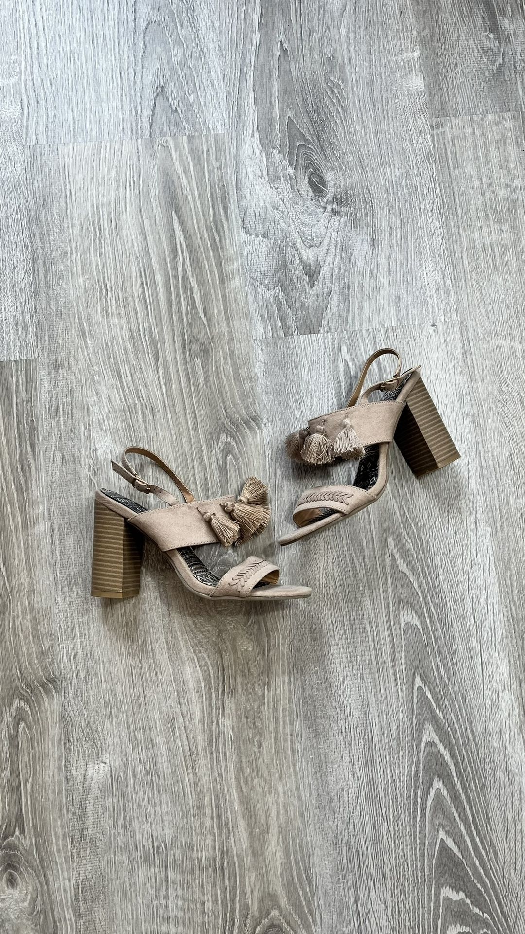 Altar’d State Size 6.5 Women’s Taupe Tan Brown Block Heel Open Toe Sling Back Buckle Tassel Sandal Heels Summer Wedding
