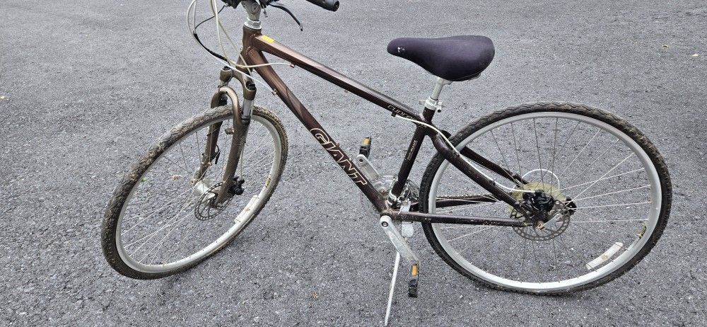 Giant Cypress LX Allux 6061 Bicycle. Alumimum alloy tubing, Shimano 24-speed gears. Smartphone bar mount. Frame has 28" wheels, 33" height of adjustable seat. Needs new innertubes for wheels, but otherwise in great condition. Includes helmet, gloves, U-shaped lock, cable lock, bike night lamp, basket for handle bars, bike rack for car.