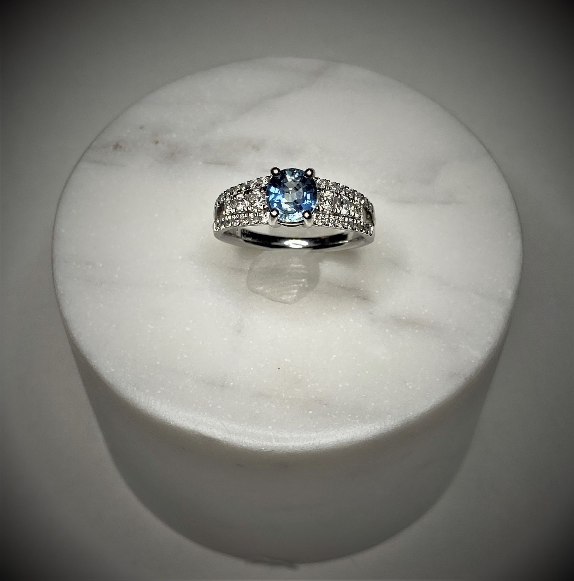 1.15ct center stone surrounded by 34 diamonds for an additional .44 carats. Stones are mounted on a 14k white gold ring. I acquired this ring new and it is unworn and a size 6.5. AIGL certified appraisal included with stated replacement cost of $5,915.