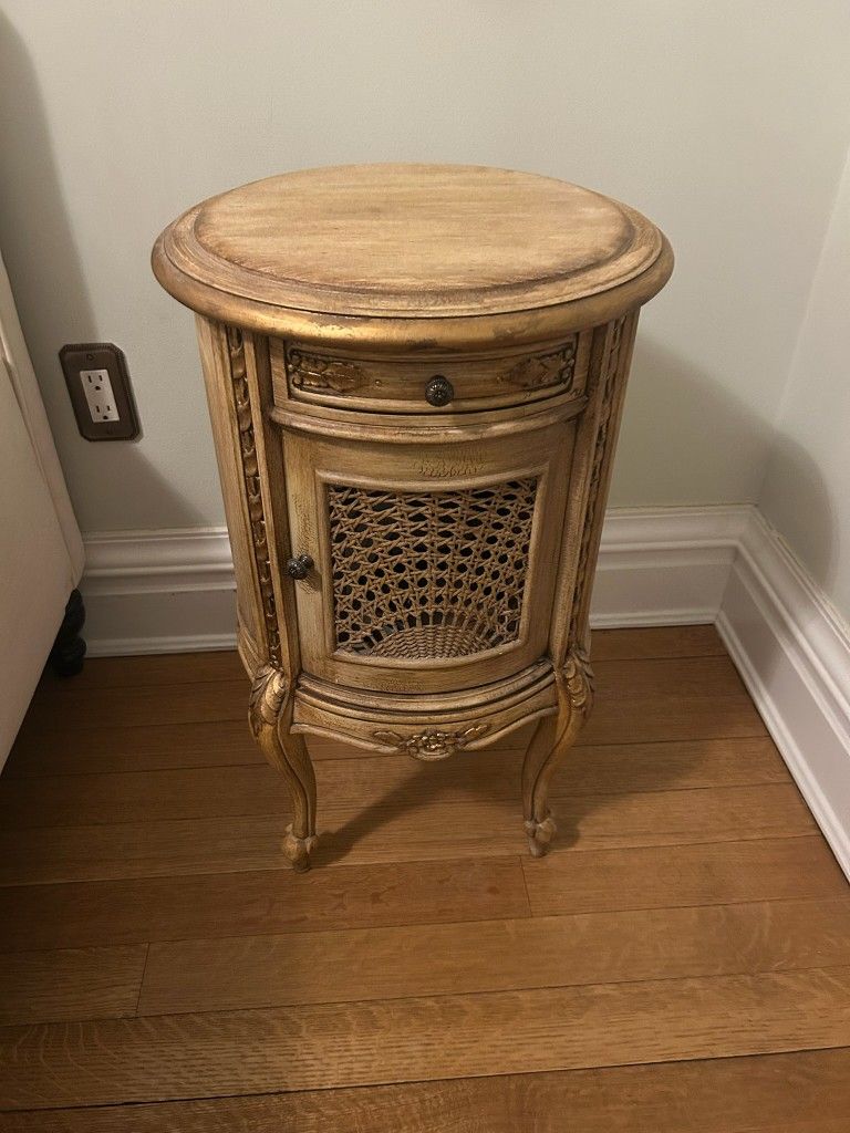 Selling 2 charming vintage-style side tables with carved wood details, cabriole legs, and a cane-front cabinet door. Beautiful patina gives a warm, antique look. Works well as nightstand, end table, or accent piece in traditional or eclectic interiors. - Gently aged wood finish with subtle gold accents - Single drawer + front cabinet (woven cane detail) - Approx. 25.5" high and 15.5" wide at the widest point - Some expected wear consistent with vintage character - Pickup near Columbus Circle - Smoke-free home. - $100 for the pair.