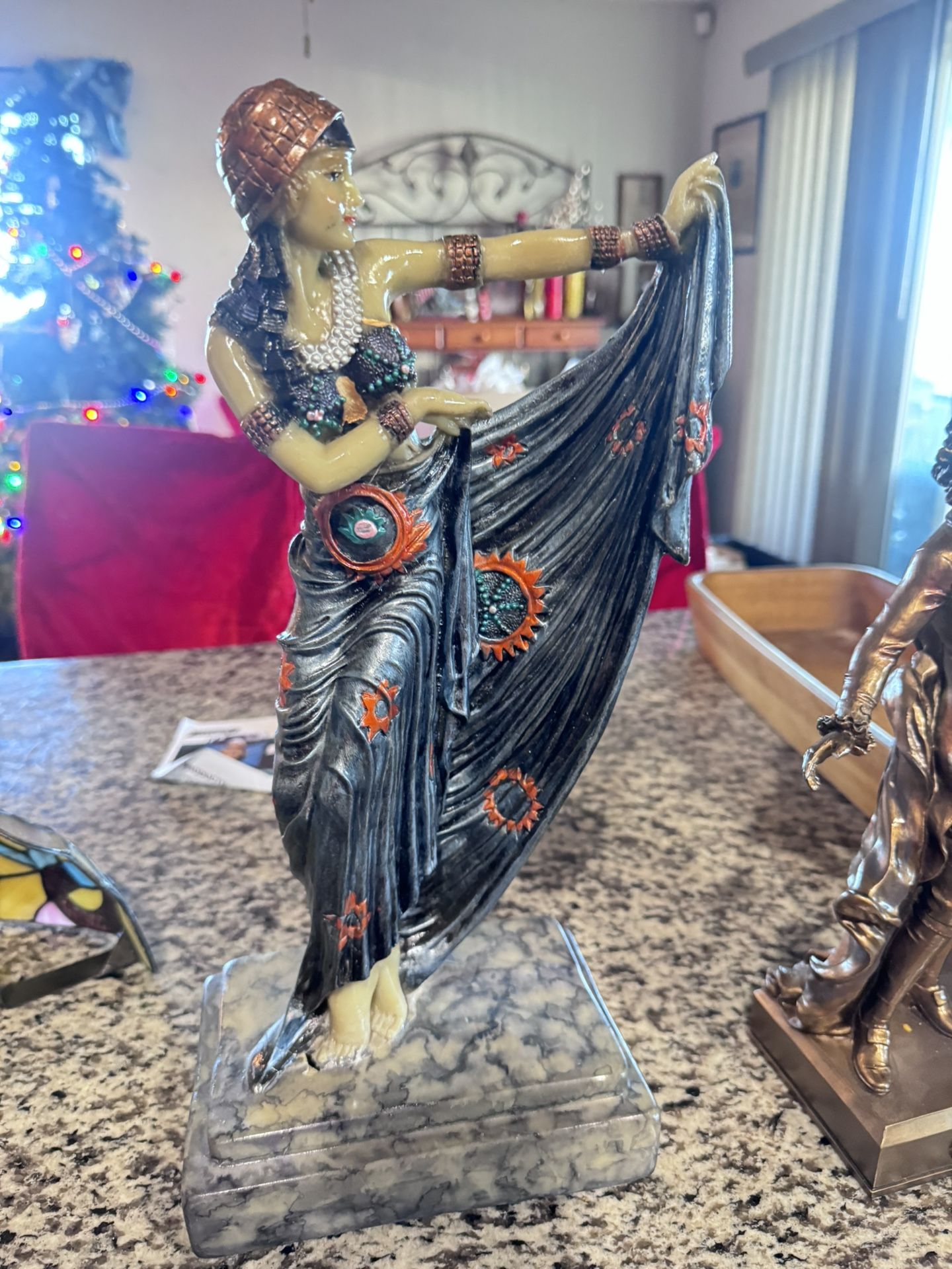 It is a reproduction inspired by the works of Romanian-born Art Deco sculptor Demetre Chiparus. The sculpture is hand-cast using real crushed stone bonded with high-quality designer resin. Each piece is individually hand-painted by artisans to replicate the original style. It is designed as a decorative home accent p Dimensions: 10.5"Wx5.5"Dx16"H 5 lbs. Hand-cast using real crushed stone bonded with high quality designer resin Each piece is individually hand-painted by our artisans Perfect for Home or Gallery Palette of muted metallics and finished with flesh tones