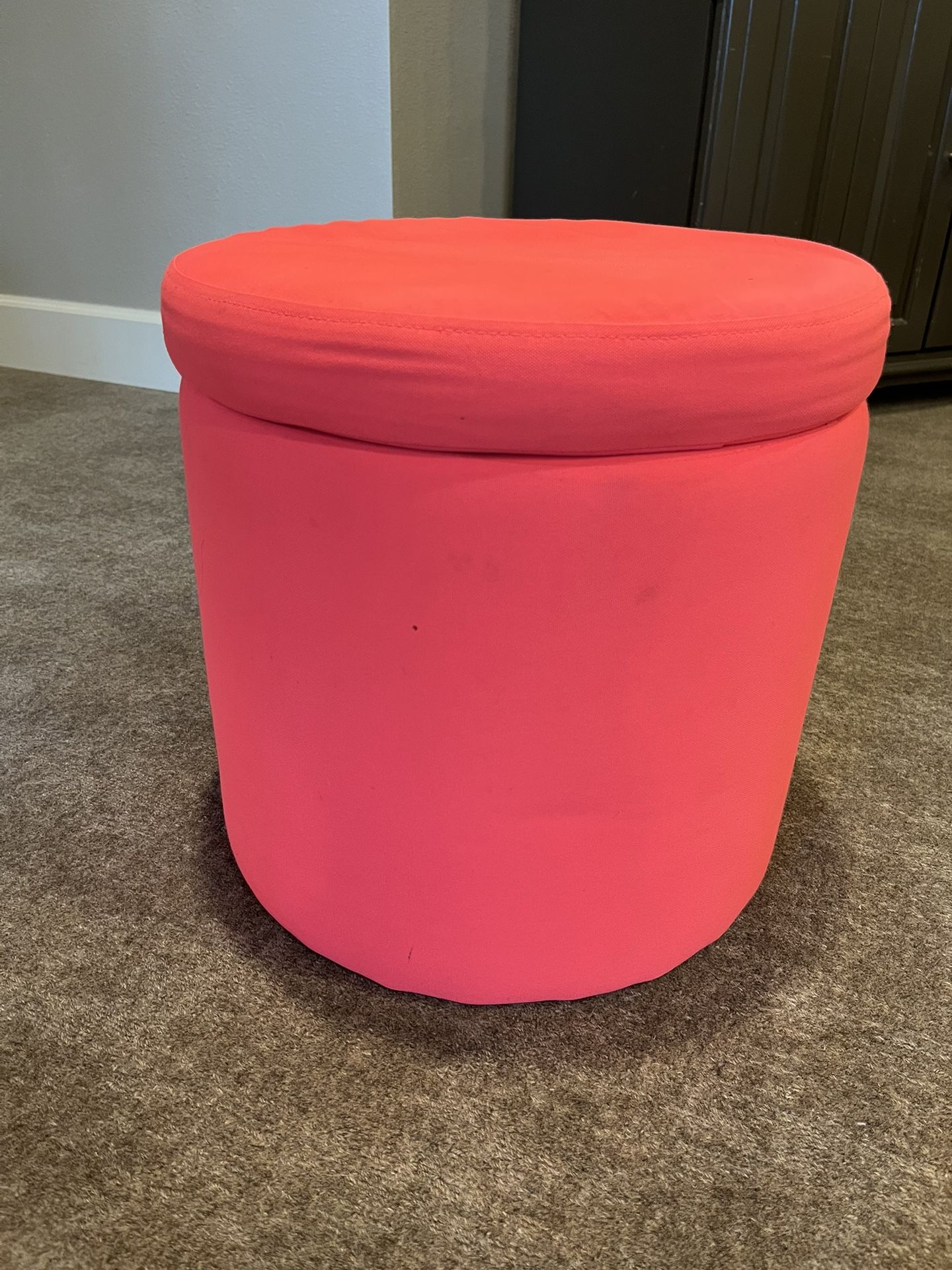 My daughter used this in her room until she “grew out of pink” (cue the tears!). Has some spots on it from kid life but does the job quite happily as an extra seat for craft projects or a place to store fuzzy unicorn diaries and notes from friends. :0) Enjoy!!