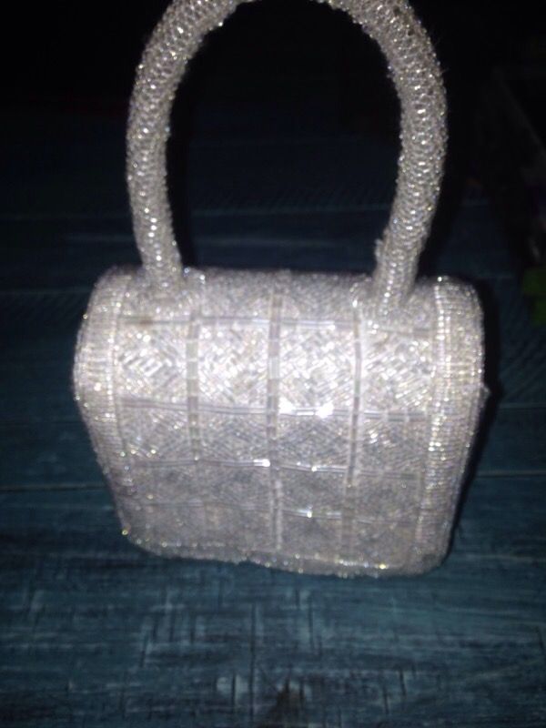 -white -beaded -fancy -7.5" length (with strap) -4.5" width -inside smooth, clean fabric -easy buttoned open & close
