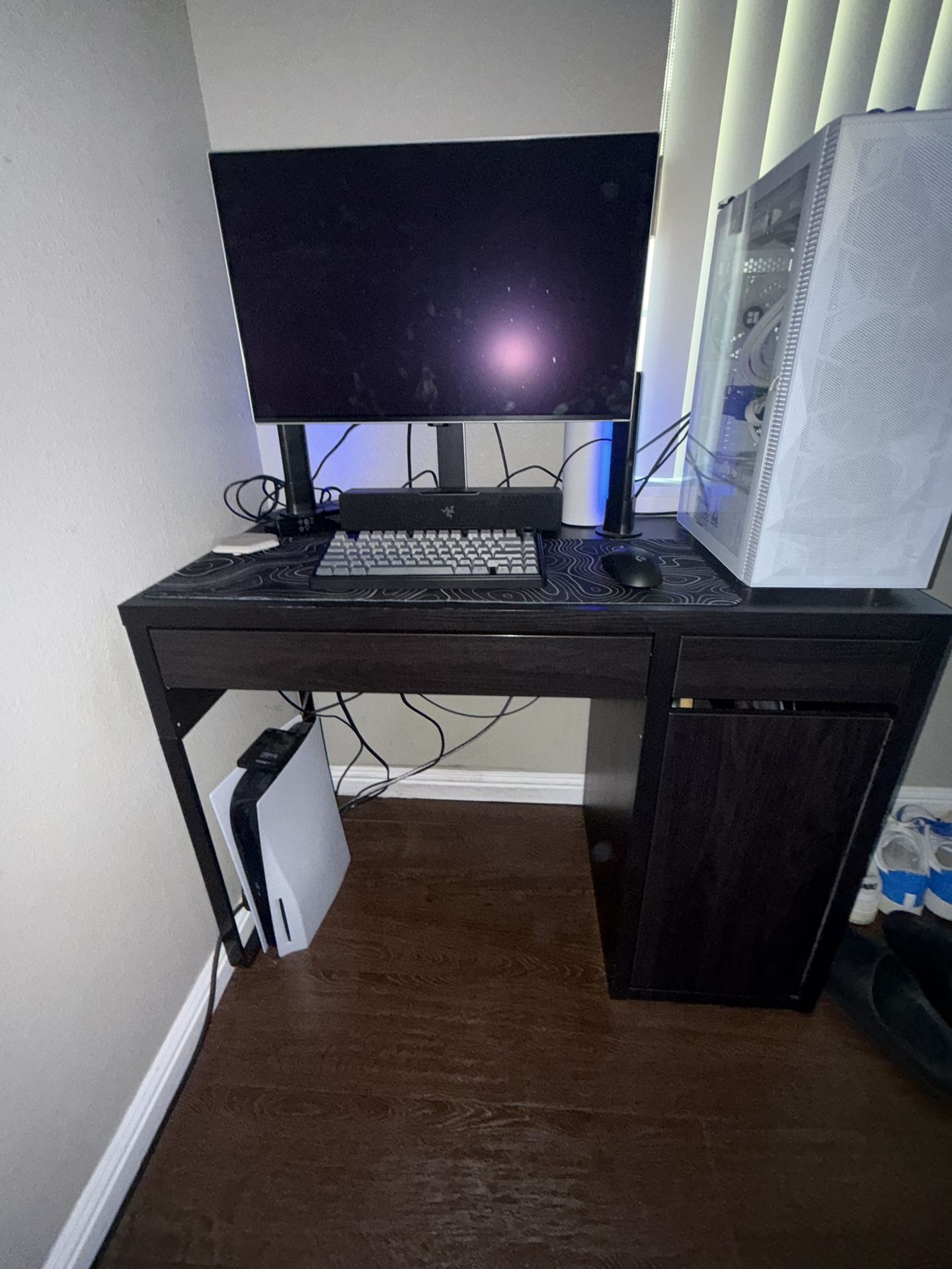 ONLY SELLING THE DESK!! Perfect desk for someone who either games with one monitor or wants to do school work. Good storage spaces with 2 pullout drawers--one underneath the middle of the desk and one on the top right side of the desk--and a side drawer compartment that has three shelves Super sturdy but does have some minor scratches If interested, I can send more pictures! Length: 41 3/8 inches Width: 19 5/8 inches Height: 29 1/2 inches