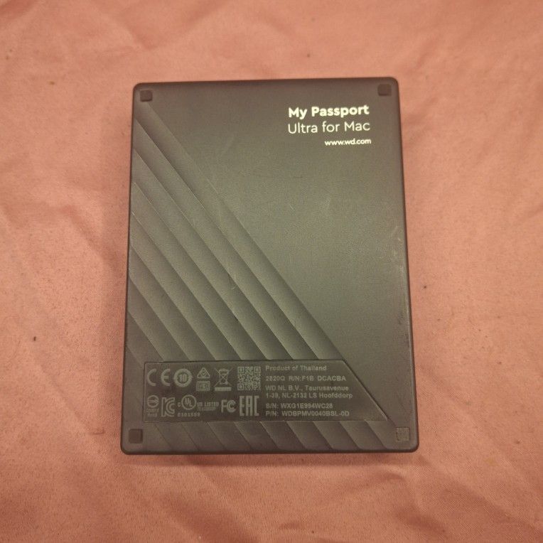 Portable external hard drive for Mac. Made by Western Digital, features 4 TB capacity,USB-C compatability and USB 3.2 Gen 1. In as-new condition, new unit costs $150 + No box or manual. Only l$70 cable included
