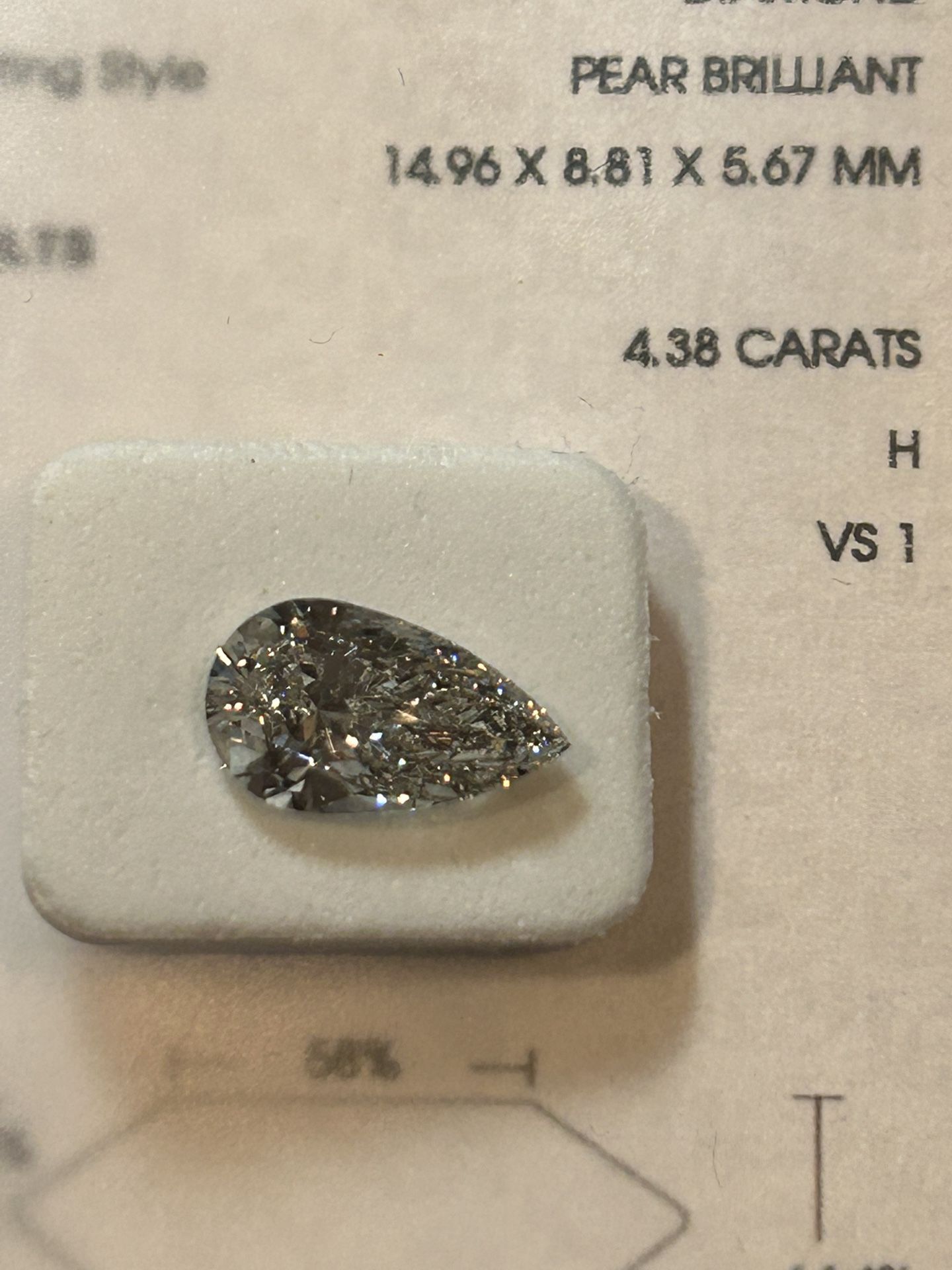 This is a beautiful, 4.38 carat H color VS1 pear shaped lab grown diamond. Excellent cut and symmetry, IGI certified and laser inscribed on the girdle. I have the original certificate. The offer is for the loose stone only. I can have it set for you as shown in the last picture, with LGD hidden halo and side stones for an additional $1000, and other settings are also available so just send me a picture of what you like. I also have a matching 4.40 carat stone if you want a pair. Happy to meet at a reputable jeweler for verification. I live in WLA and work in Woodland Hills so can meet along the way. Shipping is also possible. I have other loose stones available and have access to wholesale diamonds (natural and lab grown). Let me know what you’re looking for
