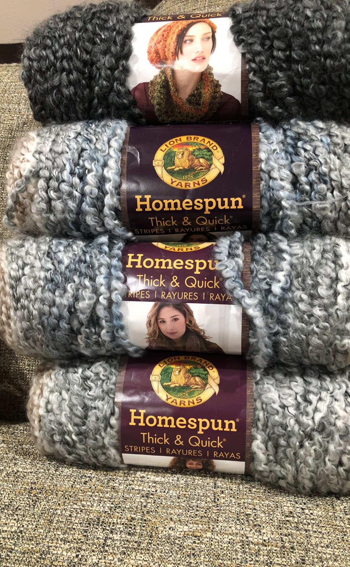 New Never Used 4 of LION BRAND YARN 🧶 Homespun Thick & Quick Each 8 OZ 227 g 160 Yards 146 m 88% Acrylic 12% Polyester Super Bulky 6 For More Information See All The Pictures Payment cash only Don’t hold Don’t deliver