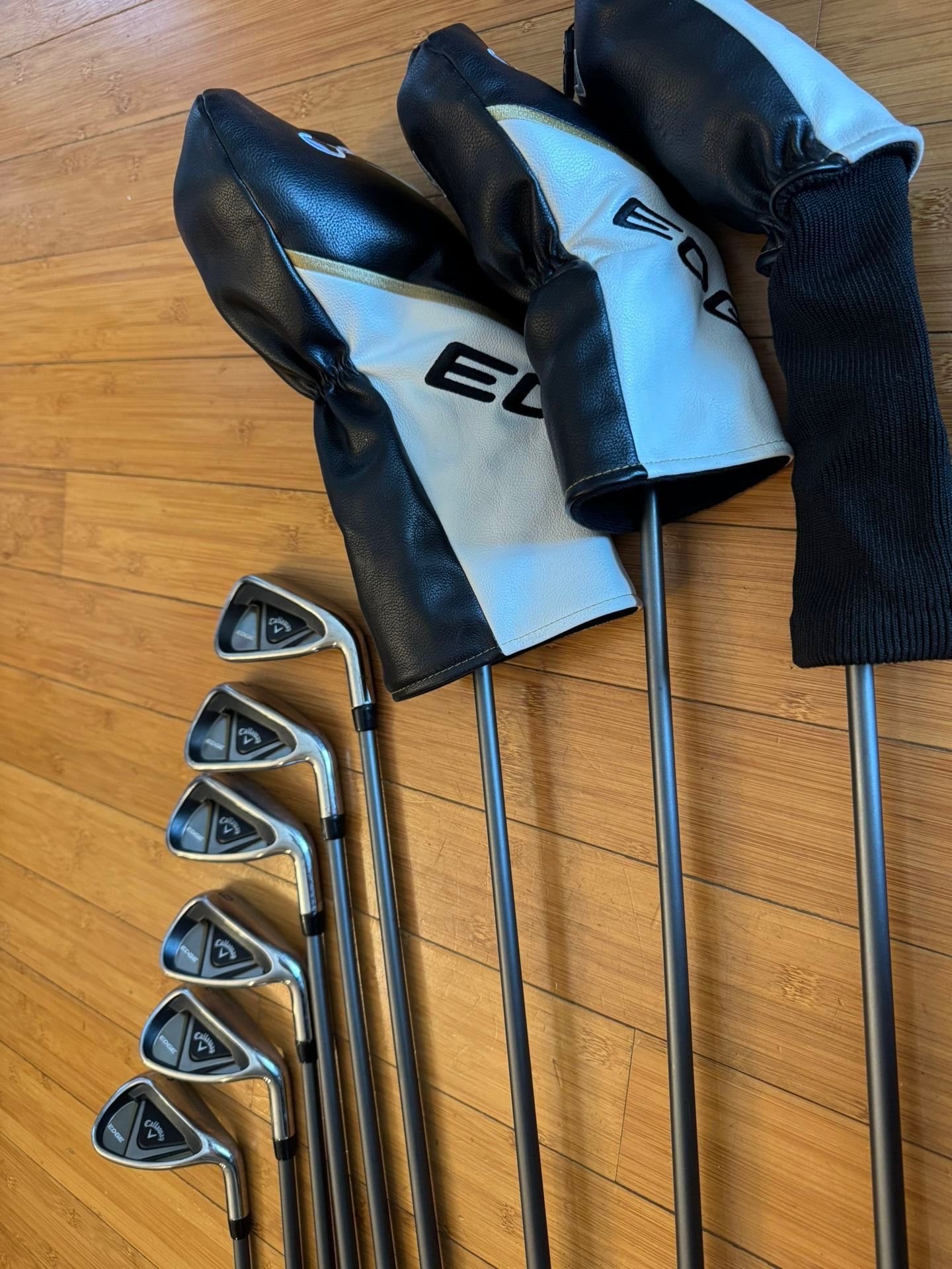 2021 Callaway Edge 9 Piece Golf Set Right Handed Regular Flex Graphite shafts Driver, 3 wood and 5 hybrid 6, 7, 8, 9 irons Pitching and sand wedge included All original grips plus head covers. No Odyssey putter