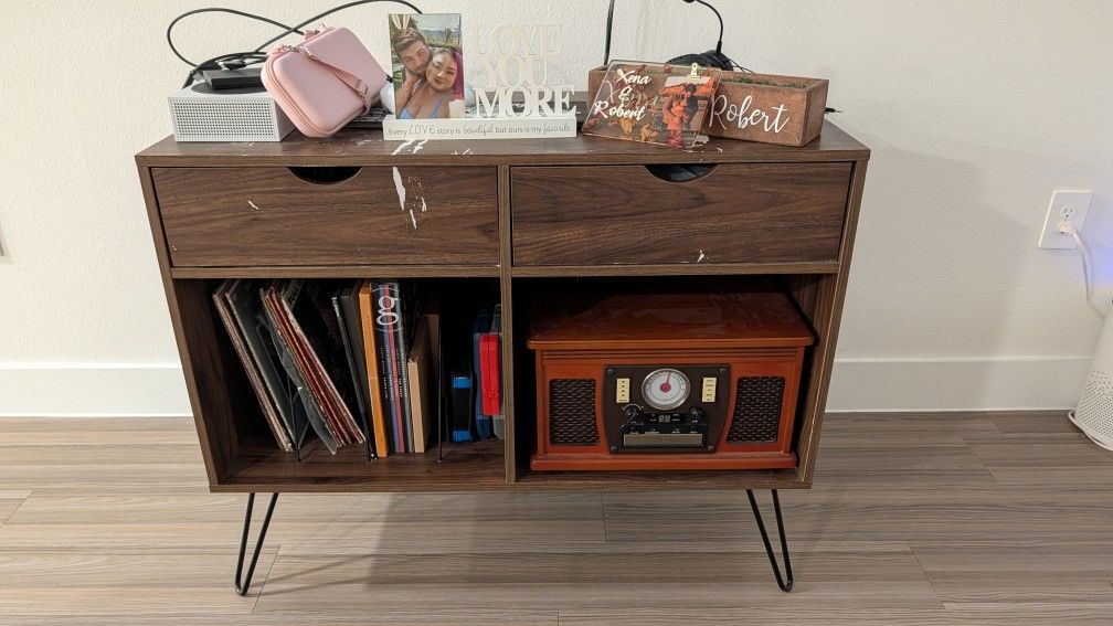 Cute vinyl table comes with rods to rearrange as you want it. The contact paper we used in this got peeled off when we were moving so you'll want to replace it.