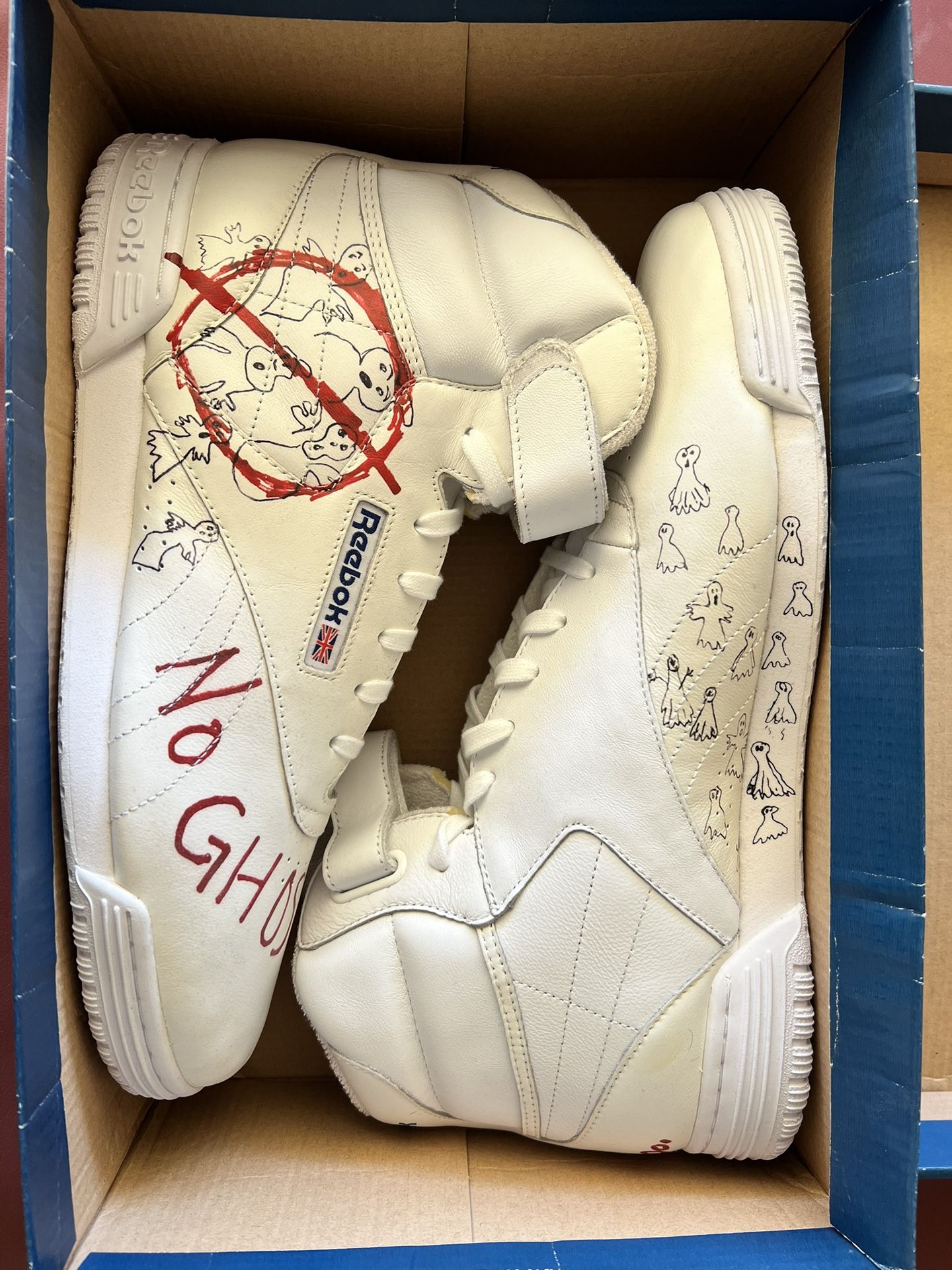 These shoes have never been worn. They’ve been in the original box since I purchased and have sat in my closet ever since. The Reebok Bait x Stranger Things x Ghostbusters x Ex-O-Fit Clean High sneakers are a stylish collaboration between Reebok and the popular Netflix series, Stranger Things. Featuring a high top design in a classic white color with chalk and paper white accents, these athletic shoes are sized at 12 for men. The model, style code, and release year are all specified, making it a must-have for fans of both the series and the brand. With a nod to the iconic Ghostbusters franchise, these sneakers are a unique addition to any sneaker collection.
