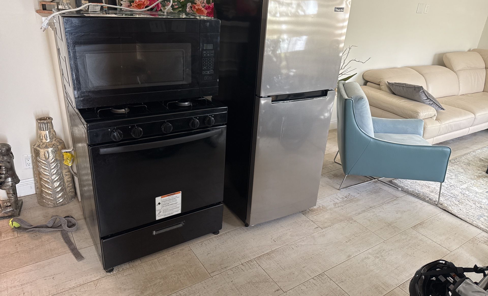 Microwave, stove and refrigerator