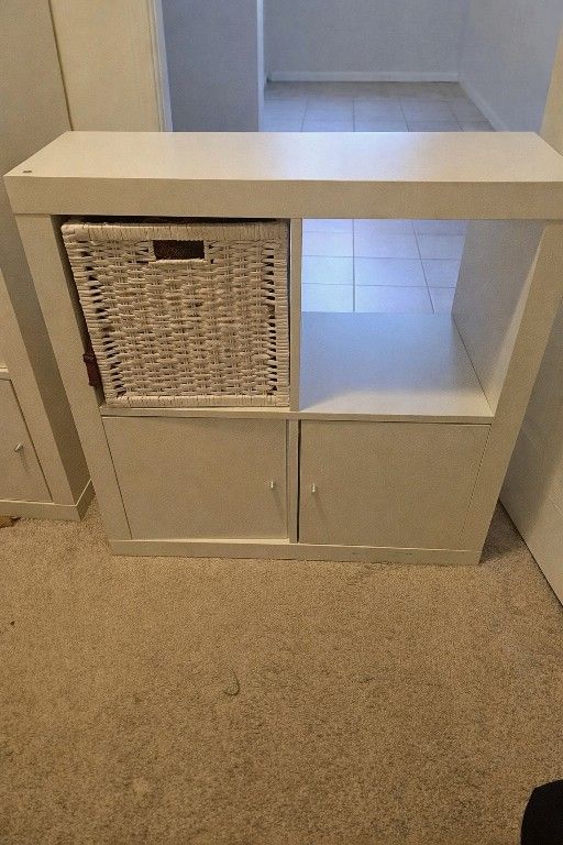 One Compact white storage shelf with wicker basket and two doors. One tall White Cabinet four doors both lightly used. Pick Up Only.