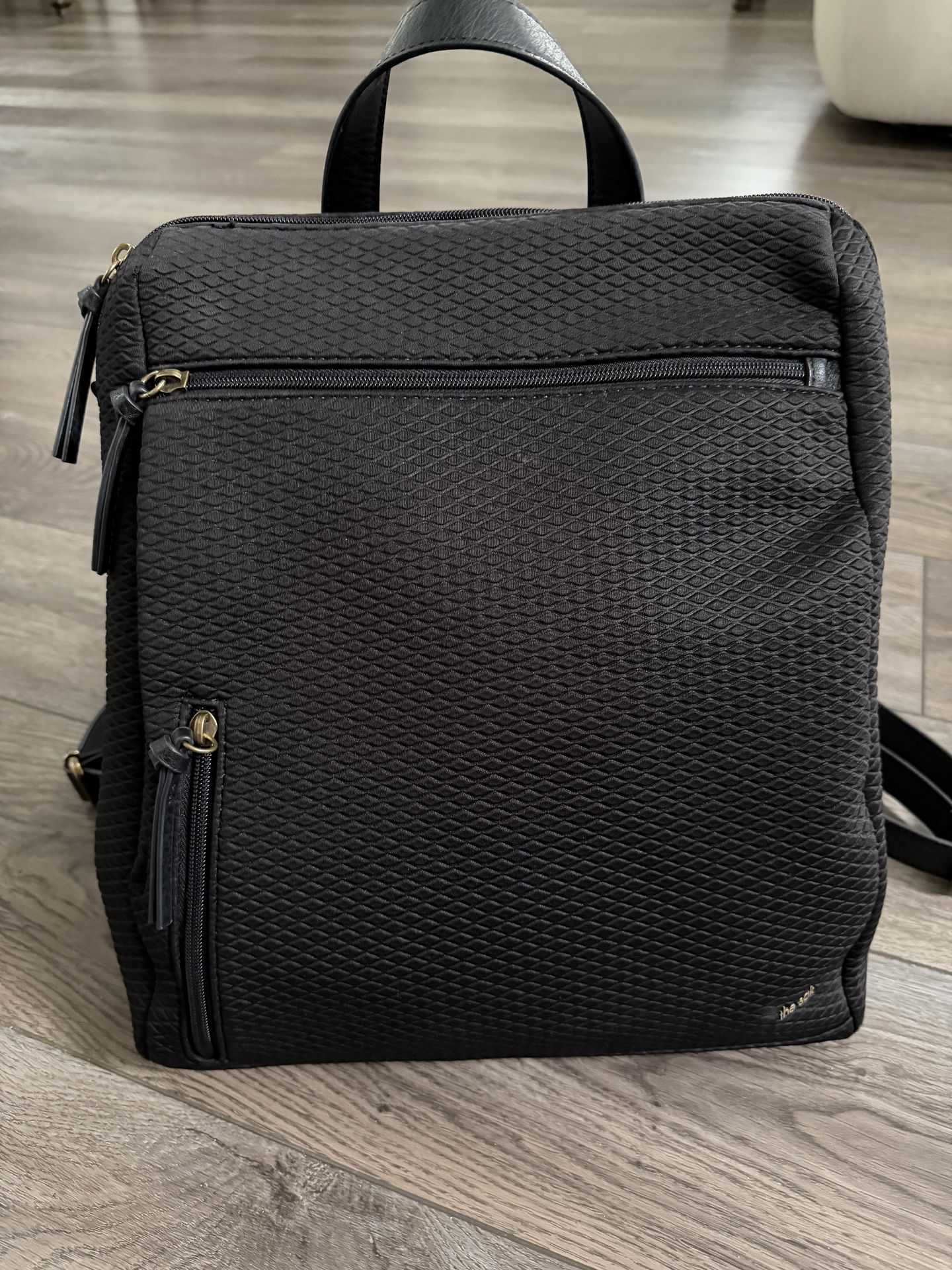 THE SAK Backpack Laptop Career Tote from Nordstrom EUC The Sak Backpack Laptop Career Tote from Nordstrom is a versatile and stylish handbag designed for women on the go. Made of durable canvas material with a solid black exterior, this backpack features many convenient zip closure and a spacious interior lined in black. With dimensions of 12" in width, 14" in height, and 5.5" in depth, it is perfect for travel, casual outings, workwear, and business meetings. The Sak brand ensures quality and craftsmanship, making this backpack a must-have accessory for any woman's wardrobe.