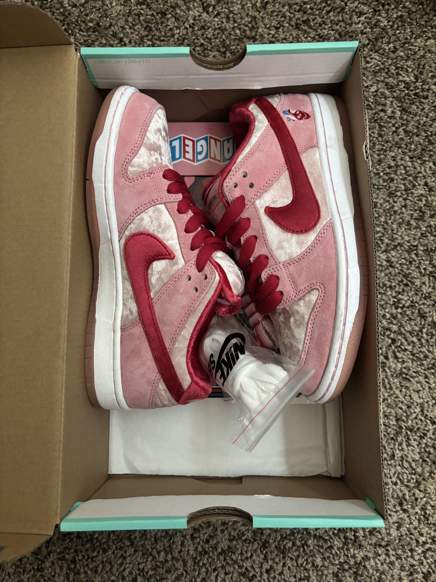 • Authenticity guaranteed • Worn just once indoors for ~1 hour, two years ago — meticulously stored in its box ever since • Condition: Nearly flawless — zero creases, no odor, spotless and looking fresh as new • Complete special packaging: • Original Nike SB box • Skeleton box • Pink heart-shaped outer box • Extras included: Three lace packs + unopened StrangeLove stickers