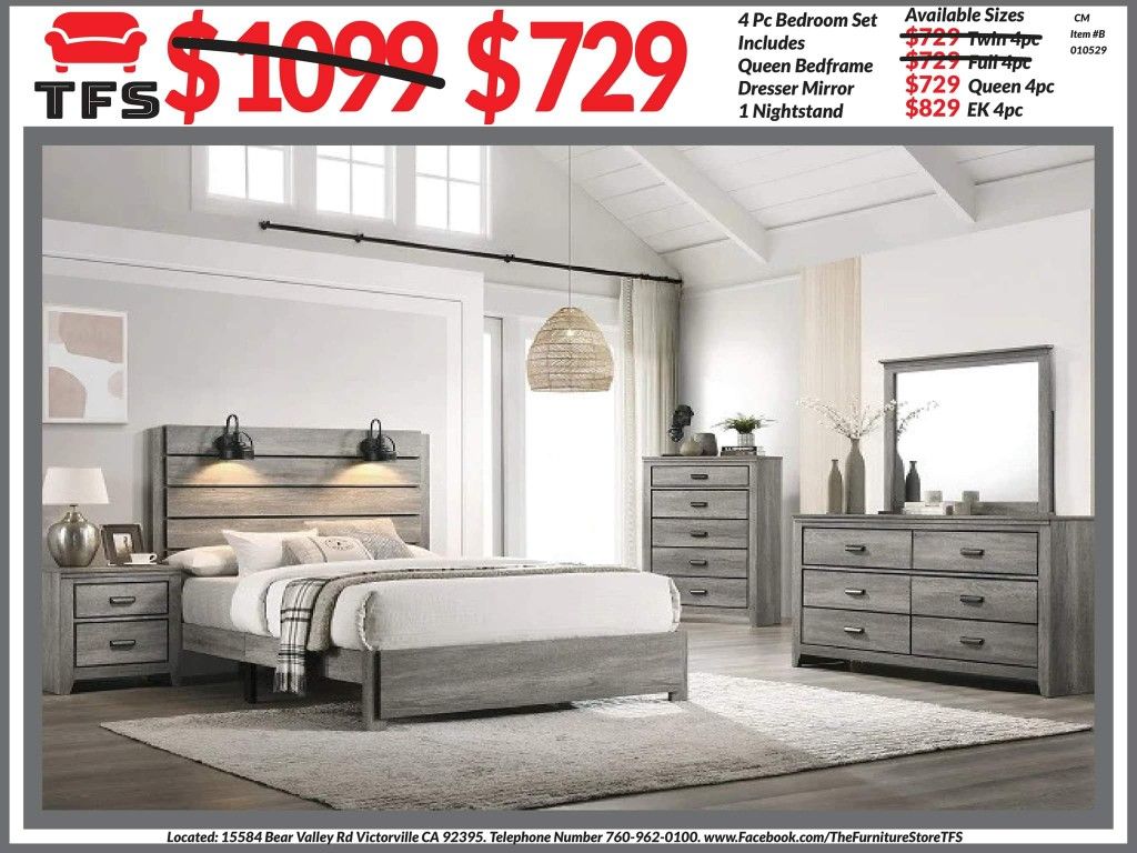 4pc Bedroom Set Queen $729 4pc Includes bedframe W/ Led Lamps Dresser mirror nightstand Gray Bedroom Set Eastern king $829 4pc Includes bedframe W/ Led Lamps Dresser mirror nightstand Gray Bedroom Set VISIT US TODAY THE FURNITURE STORE 15584 BEAR VALLEY RD VICTORVILLE CA 92395 OPEN 7 DAYS A WEEK 10AM-6PM FINANCING AVAILABLE NO CREDIT NEEDED 90 DAYS OR 100 DAYS 0% INTEREST DELIVERY AVAILABLE IF NEEDED RESTRICTIONS APPLY: Prices are Subjected To Change Without Notice