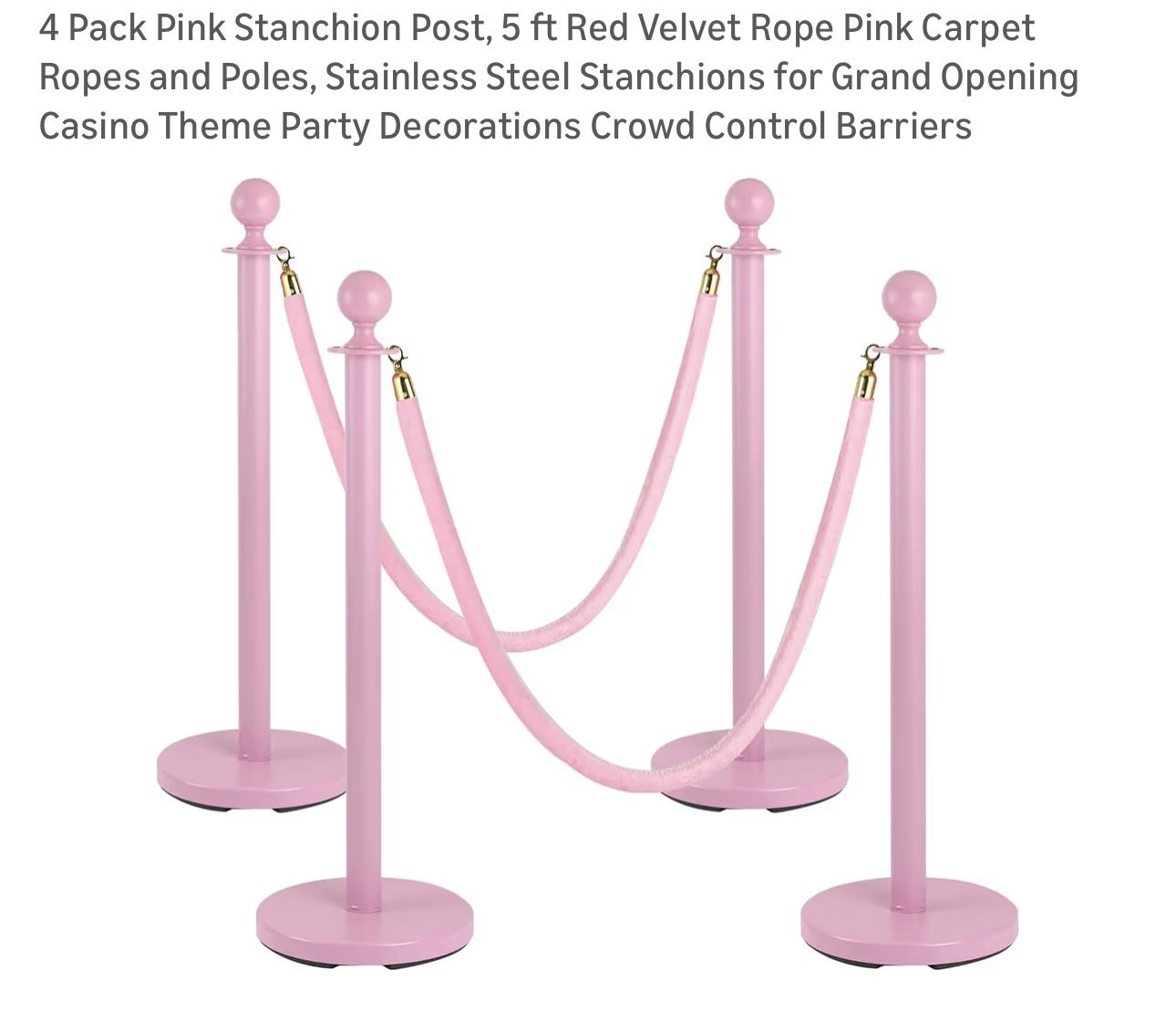 $85 Brand New 4 Pack Pink Stanchion Post, 5 ft Red Velvet Rope Pink Carpet Ropes and Poles, Stainless Steel Stanchions for Grand Opening Casino Theme Party Decorations Crowd Control Barriers