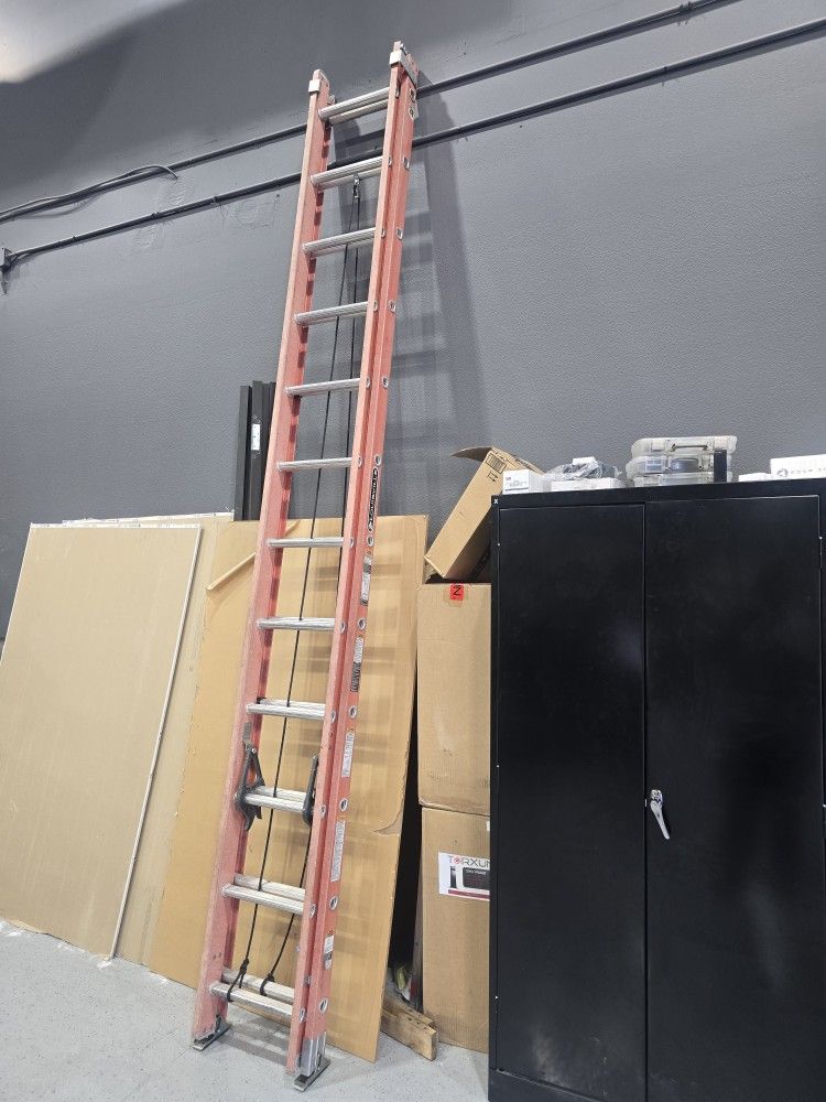 3 extension ladder 24' and 2 A frame 6' ladders available for purchase. No dents, no missing or broken parts. The 6 foot ladders are $50
