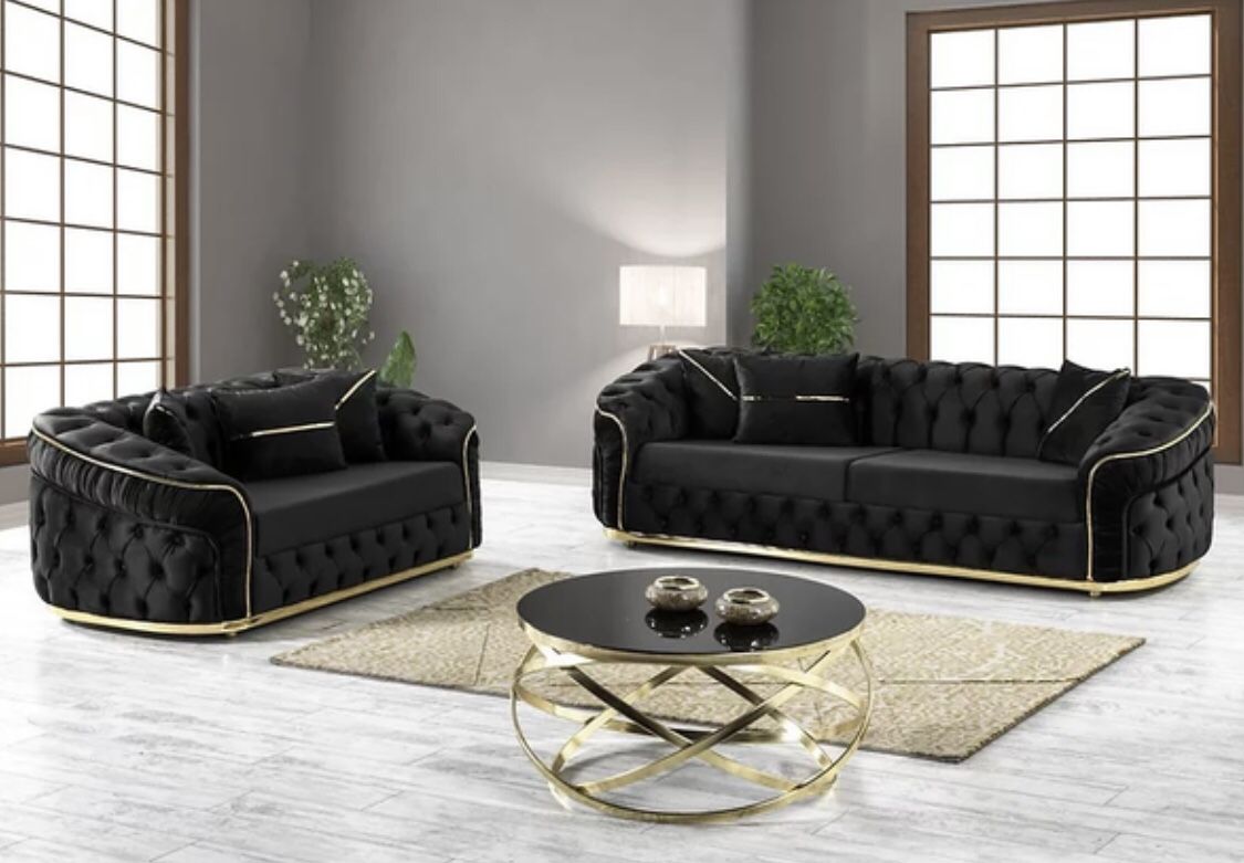 ****NOVEMBER SAVINGS**** Brand New 2 Piece Living Room Set Only: $1499 Was: $1999 Set Includes: Sofa & Loveseat Black Velvet Gold Accents Accent Pillows Included Perfect for your glamorous living room Hablamos Español Our Locations Are Open & We Still Offer Delivery or Pick Up Order From The Comfort & Safety of Your Home Or Come Check Out Our Showrooms! Message Us To Order Today! Come See Us @ Zoe’S Furniture in Richardson, TX HH CS