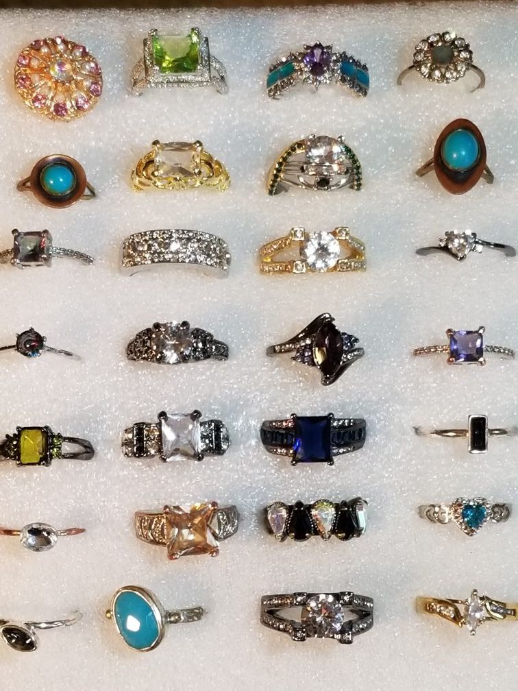 28 rings total. Various sizes. Some new. Some pre-owned. All in good shape. Asking $35 for all. Great for yard sales or flea markets. Resell for $$$.