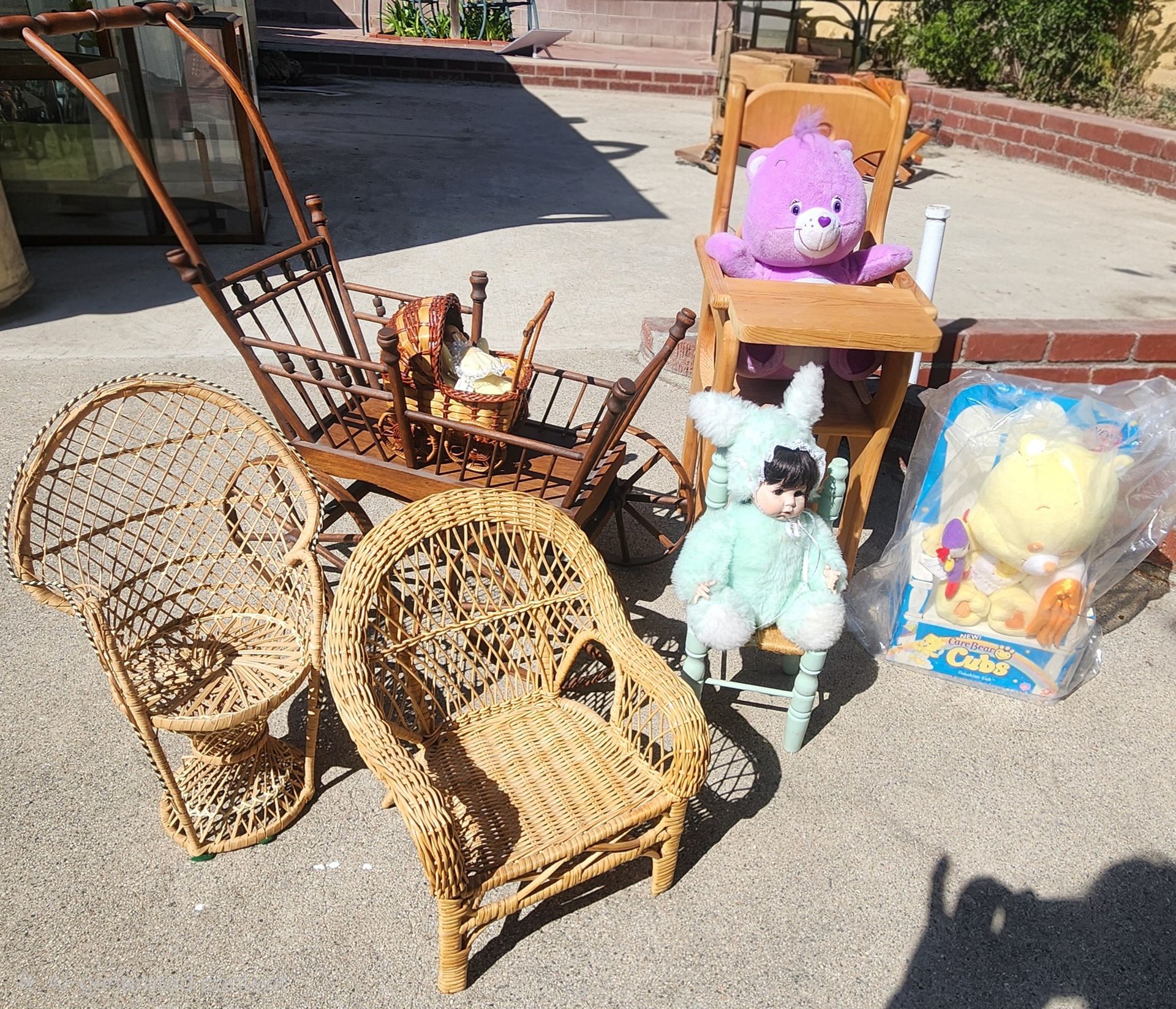 Yellow Care Bear and purple Care Bear Bunny doll with matching chair, think Easter! Vintage, like new, wooden doll pram/stroller. (Fits 18" doll) Wooden doll high chair Mini basket stroller with 4" doll 2 Rattan doll chairs All in very good condition, yellow bear is new. All items were on display at grandma's not played with. Only want someone to take the whole lot. Local pickup only Cash or Zelle