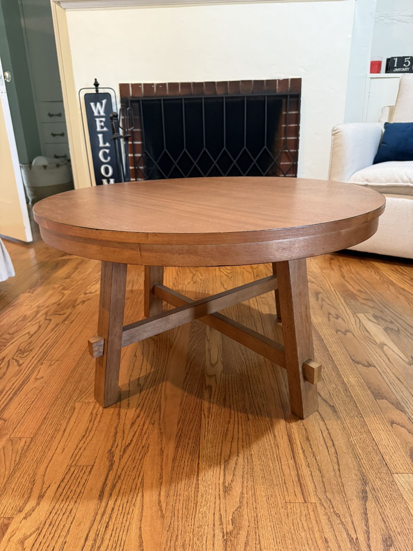 Round wood coffee table. Excellent condition. No scratches. 32” wide by 18” tall.