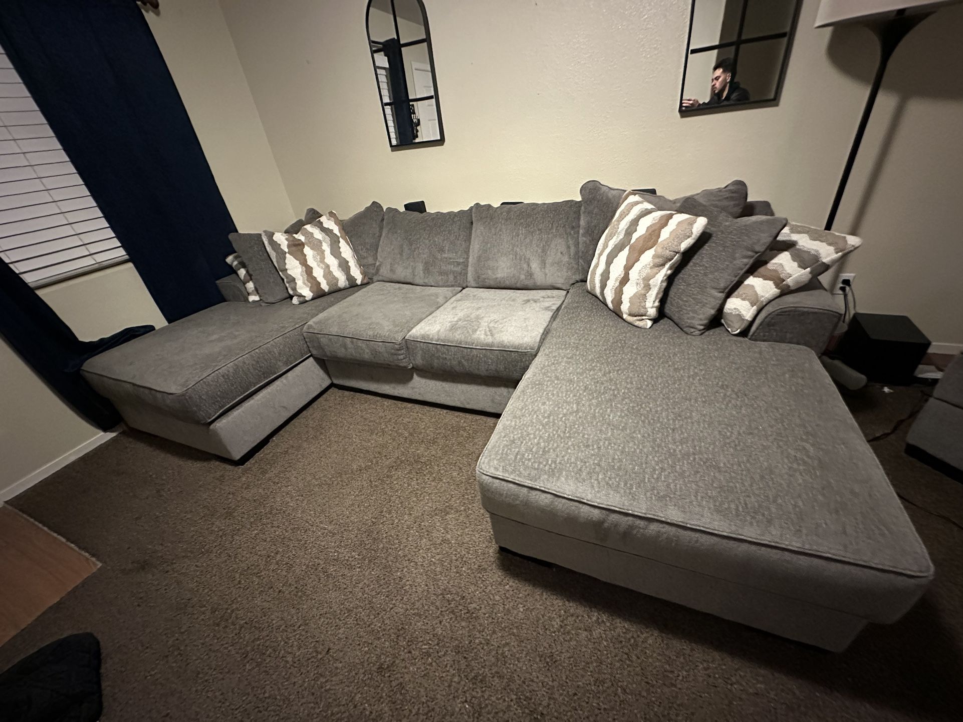 Selling a dual chaise sectional and matching storage ottoman by Michael Nicholas in Fullerton, CA Sectional is 142” across and the chaise’s are 70” deep Storage ottoman is 54” across by 26” deep. No longer need something this size, purchased in December 2024. Flexible in price within reason