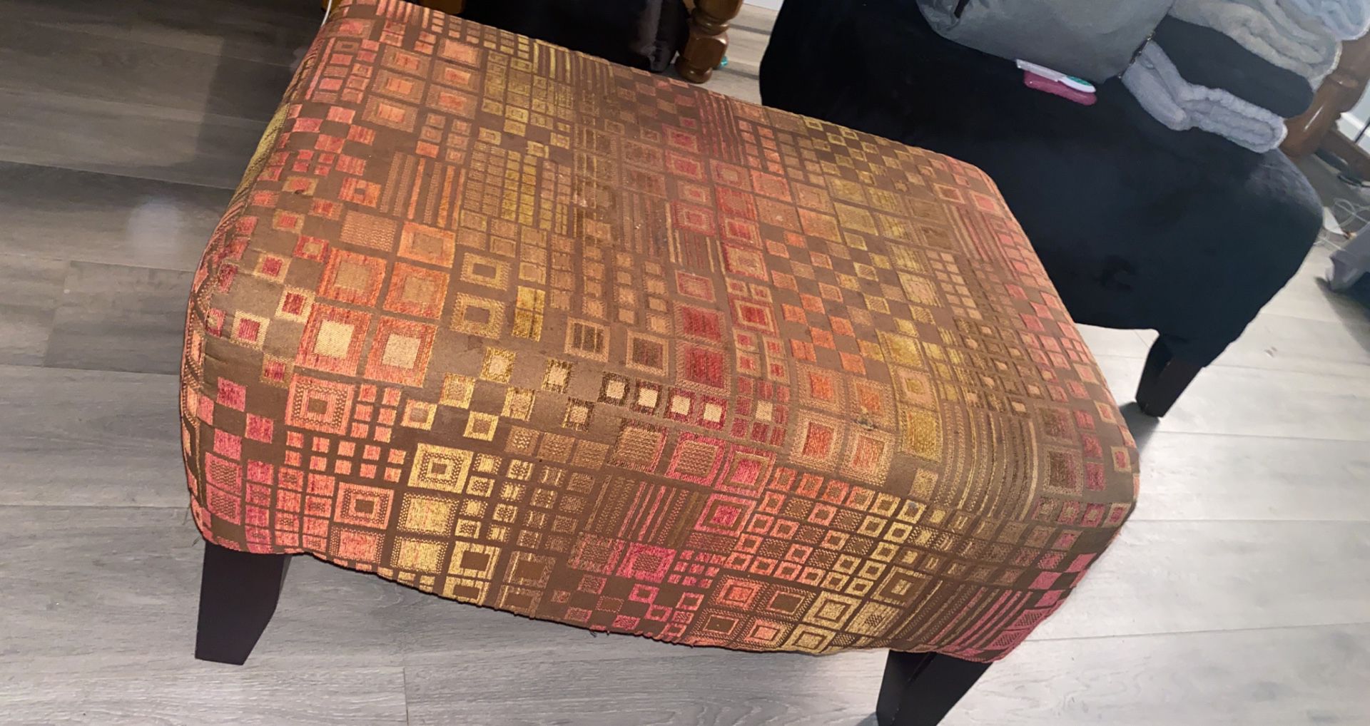 Pick by up only EASY to CLEAN Medium size rectangular ottoman. Nice piece to add to your living room especially for a pop of color. Fairly new in good condition except one corner of the side. ( a few strings loose and some paint residue on the leg that can easy be cleaned off)