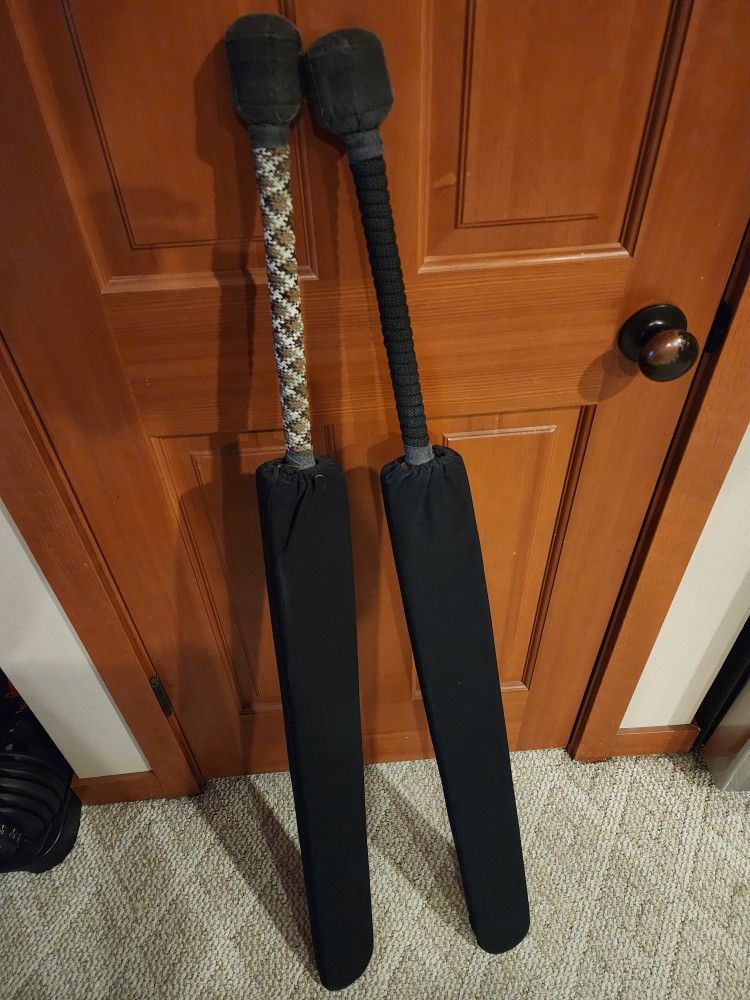 This is a pair of foam hand-and-a-half swords for mock sword fighting / boffing. They were originally made by Edhellen Armory in 2013 which appears to no longer be in business. They have a stiff core that doesn't bend and a padded foam edge suitable for contact. The foam is wrapped in fabric. The tip is NOT suitable for stabbing (it does not compress). They measure about 49" long, with the "blade" part being about 35.5" long, 3.5" wide, and 1.5" thick.
