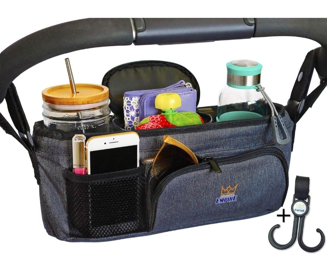 Stroller Organizer with Cup Holder that keeps Drink Level on Any Handle Angle