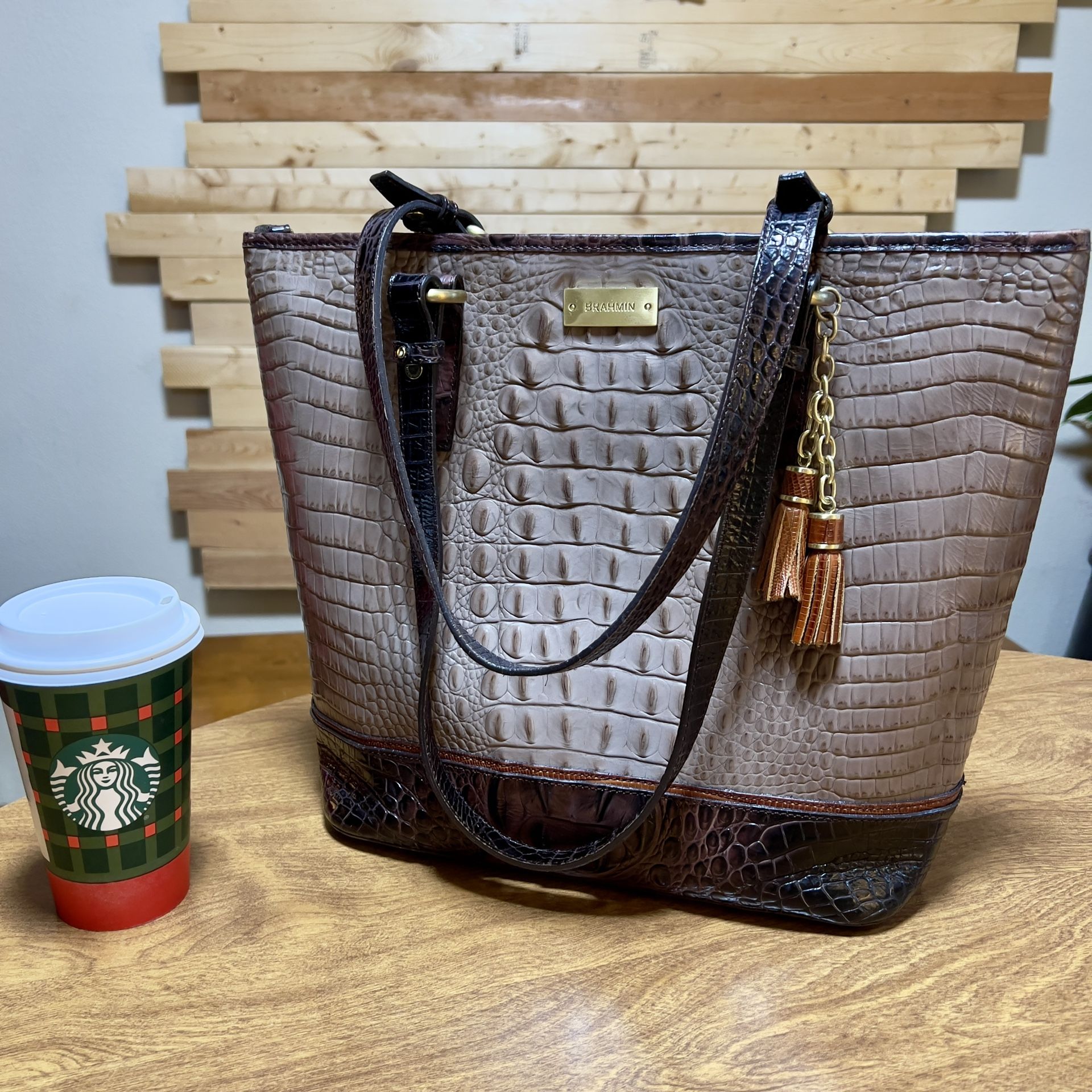 Preloved in Great Condition. Measurements are included in the Photo. Brahmin Melbourne Multicolor Croc-Embossed Leather Tassels Charm Zipper Closure Tote Shoulder Bag. The handbag in the image is a Brahmin Medium Asher Tote in a croc-embossed leather finish, likely in a multicolored Brown Tan, Ash Gray color. This specific style features a structured silhouette, dual adjustable handles, gold-tone hardware, and a charming gold-chain tassel detail.