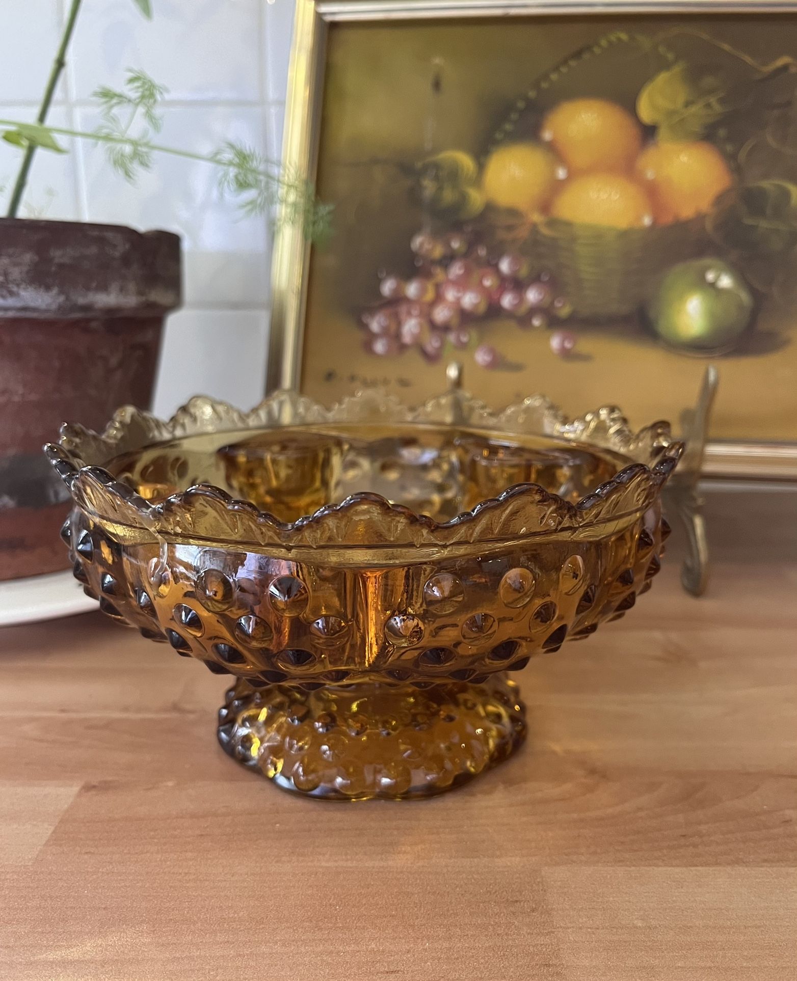 Vintage Fenton amber hobnail glass candle holder center piece with scallop edging. Has inserts for 5 taper candles along the rim and one candlestick insert in middle. No imperfections, in good vintage condition. Measurements in photos.