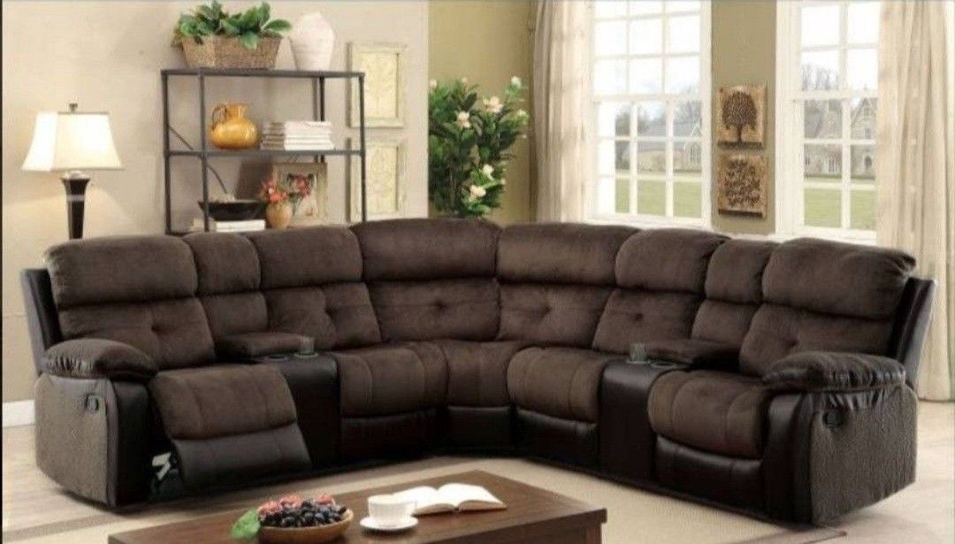 We are an online wholesaler and we deliver directly from the manufacturer to your home Delivery is only $40 Brand new in the boxes Assembly is an extra charge We accept cash on delivery Item#: CM6871 A spacious design to accommodate you and your friends, this L-shaped sectional is a perfect fi t for the frequent movie night host. Recline in comfort with the double fabrics and enjoy having your drink near at hand with the convenient storage consoles and cup holders. Transitional Brown, Black Champion Fabric, Leatherette, Solid Wood, Others Recliner Plush Cushions Built-in Cup Holders & Storage PRODUCT DIMENSION Sectional w/ 2 Consoles 111 1/2"L X 111 1/2"W X 41 1/2"H
