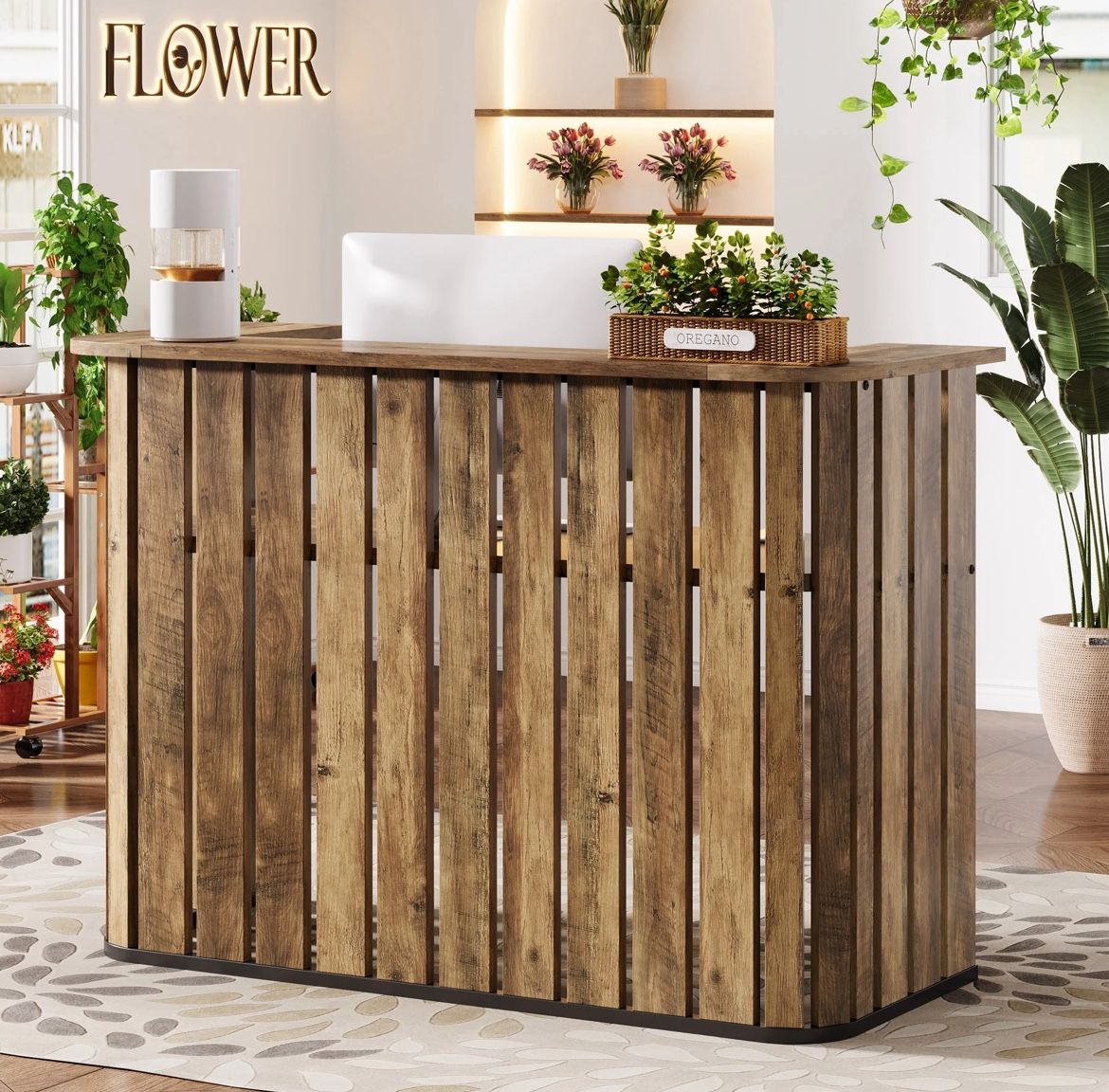 New in the box, FREE shipping! Sleek Reception Desk - Our modern desk showcases a rich imitation brown finish and a unique slatted frame. It's a perfect blend of privacy and creativity, with a U-shaped workspace to keep distractions at a minimum. Spacious Design - Enjoy a large 63"L x 24"W work surface with a two-tier layout, accommodating all your office essentials. Perfect for boosting your productivity. Versatile and Practical - This desk isn't just for receptions. It is ideal for retail counters or as an elegant office desk, fitting seamlessly into any setting thanks to its sleek design. Built to Last - Crafted from E1 MDF, the desk features a U-shaped structure for durability and metal supports for reinforcements. It has a significant weight capacity of up to 250 lb. Hassle-Free Assembly - With detailed instructions, necessary tools, and clearly labeled components included, setup is smooth.