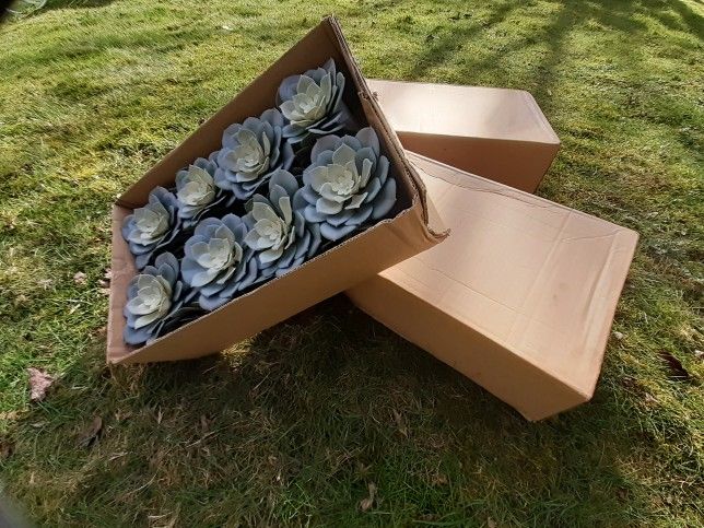 4 inches across, each with a 3" pick/stem on the back. This is considered a blue echeveria variety but obviously it's not really blue. More of a grayish tint. Pretty realistic looking fake succulents! Price is for all. Located in Greenwood!