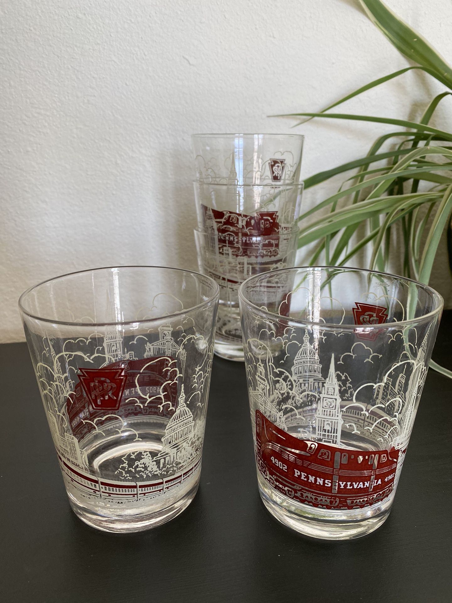 1950’s Lowball Glasses commemorating Pennsylvania Railroad Engine 4902. Nicely weighted, perfect condition 4.5”h (49-7)