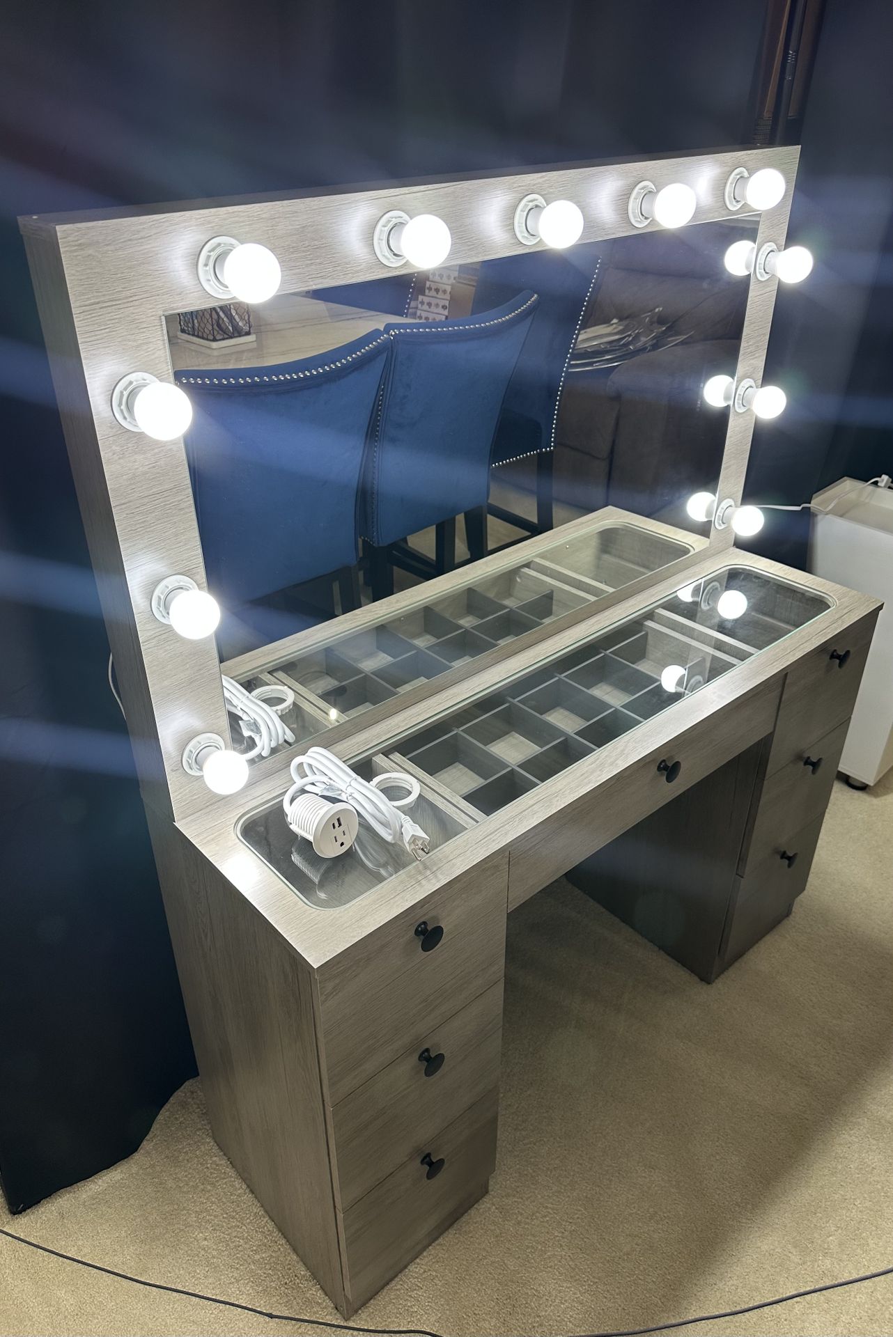 Brand New Makeup Vanity Table Rustic Gray Wood with LED Lights 7 Drawers and USB (Type A & C). Just removed from the box and assembled. The total height is 56 inches, width is 47 inches, depth is 16 inches.