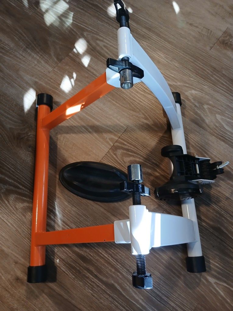 Bicycle trainer--turn any bicycle into a stationary bike. Adjustable resistance, front wheel holder included.