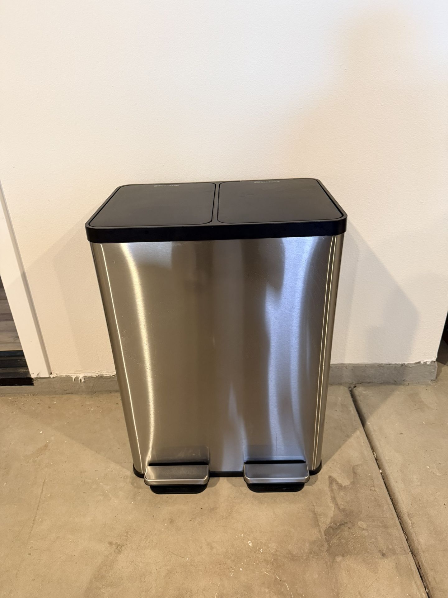 Like-new dual compartment trash can in excellent condition. Used for about 5 months and very well cared for — clean, fully functional, no dents or damage. Dual bins make trash and recycling easy. Soft-close lids with foot pedals. Modern stainless steel design looks great in any kitchen or garage. Originally $130 on Amazon. Priced for a quick sale. Pickup preferred. First come, first served.