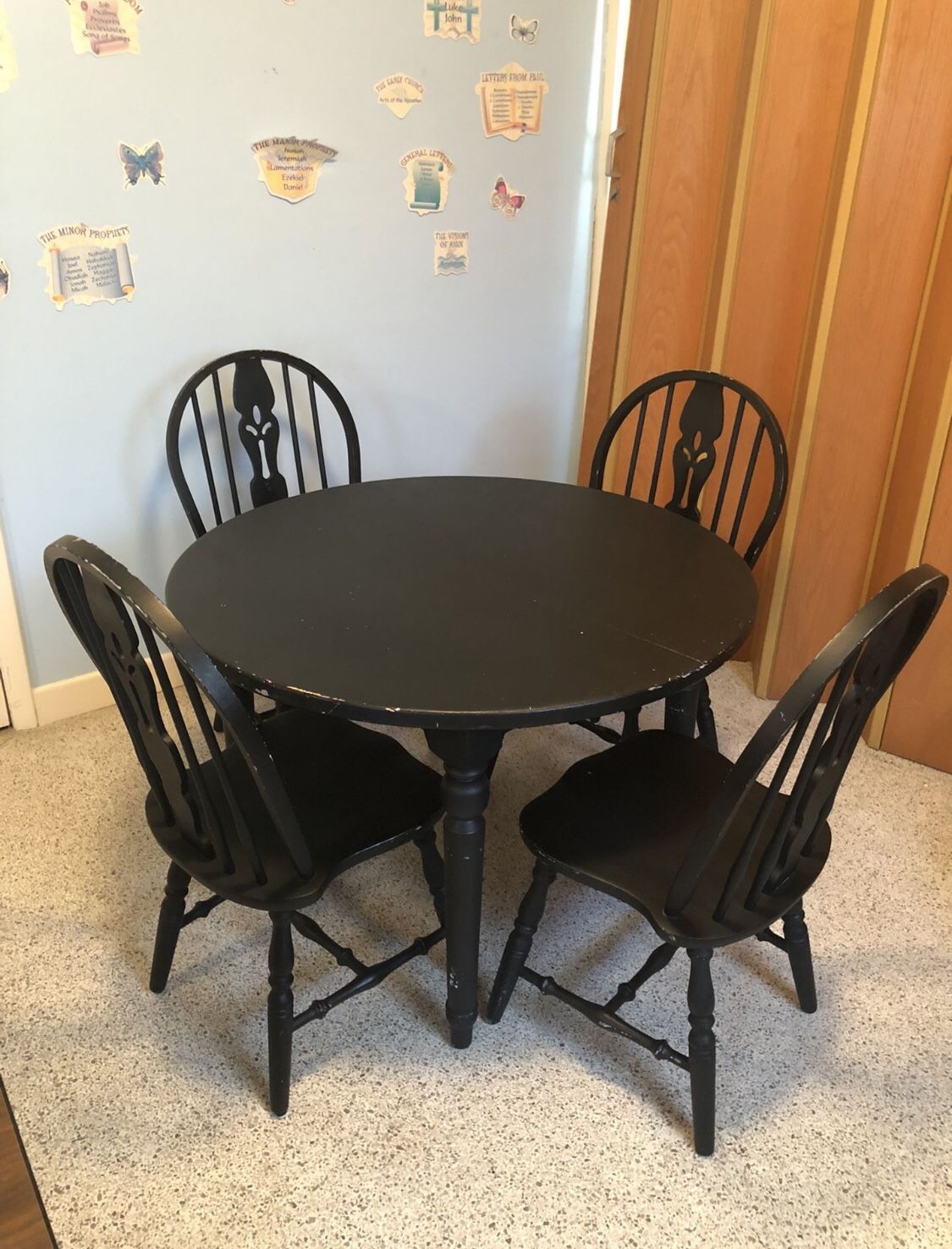 Wooden Dining table set NEED GONE ASAP In good shape Distressed style Needs a little tlc but the table and chairs are solid OPEN TO REASONABLE OFFERS! WILL DELIVER FOR A FEE DEPENDING ON HOW FAR Please feel free to ask any questions you may have but will not respond to is this still available! Have a nice day!