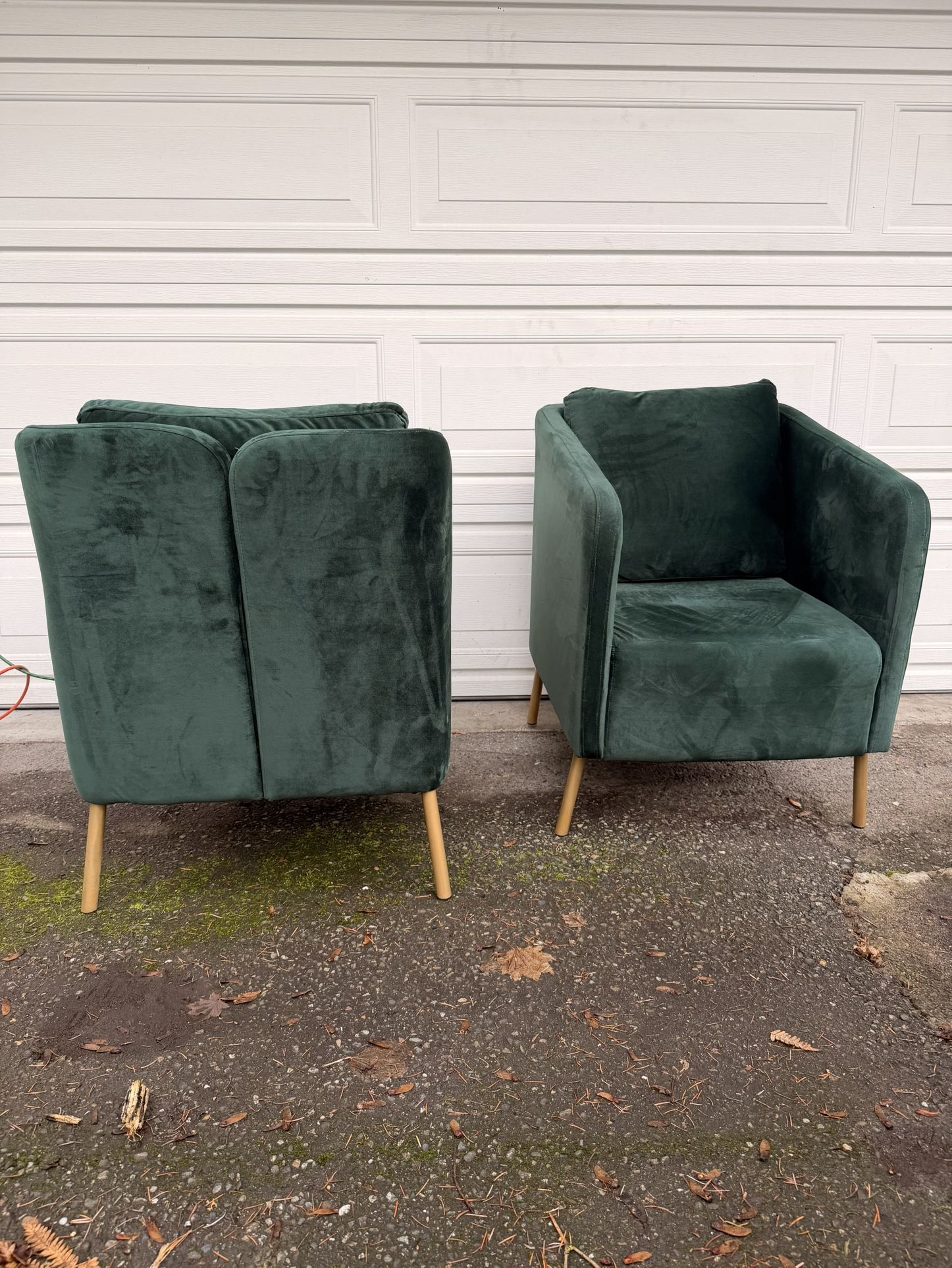 Modern accent chairs featuring green velvet fabric upholstery, a deep seat, and tapered wood legs. Excellent condition and hardly used. No stains. No smells. Dimensions: Overall dimensions are ~ 29.5" D x 28.5" W x 30.5" H. Pickup only Sold as a set