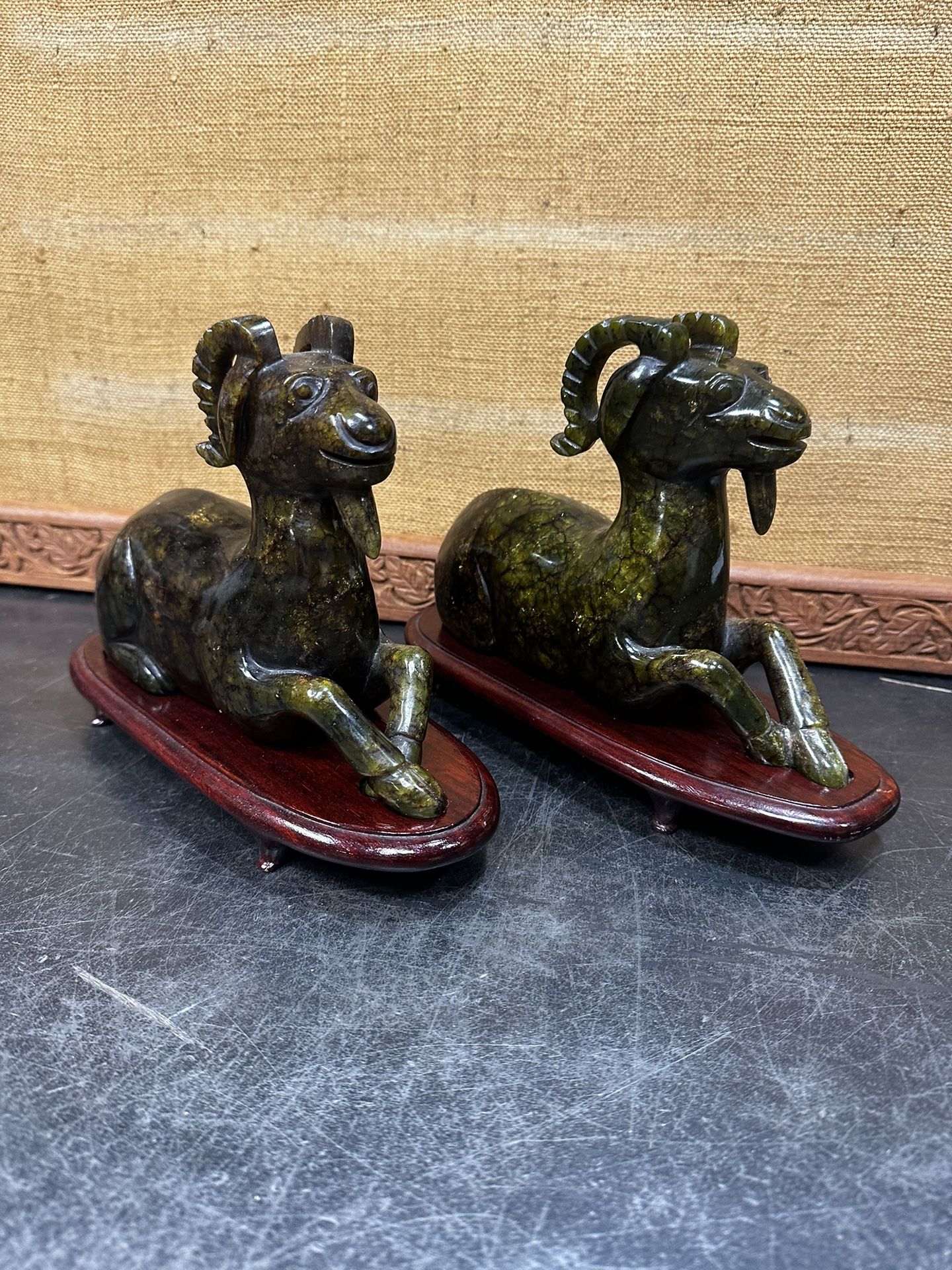 Pair Of Chinese Hetian Jade Carved Rams Statue Sculptures Huanghuali Base Qing