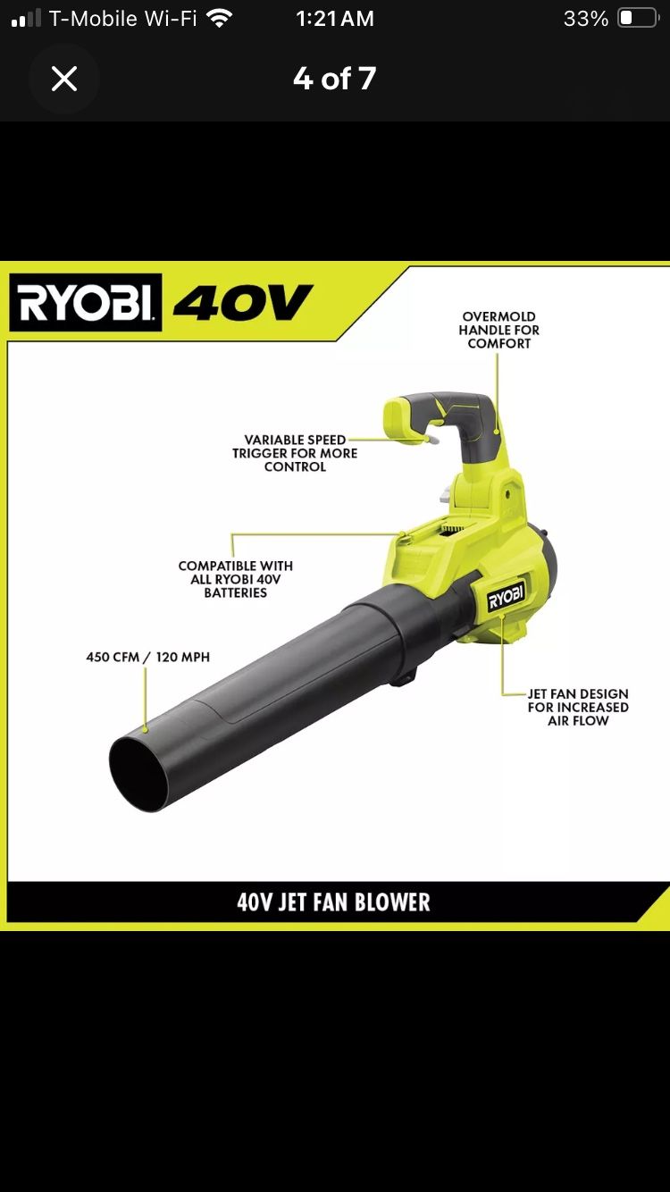 RYOBI 40v cordless leaf blower. Tool only—NO battery, NO charger. Open box. Tested and working $70 best offer